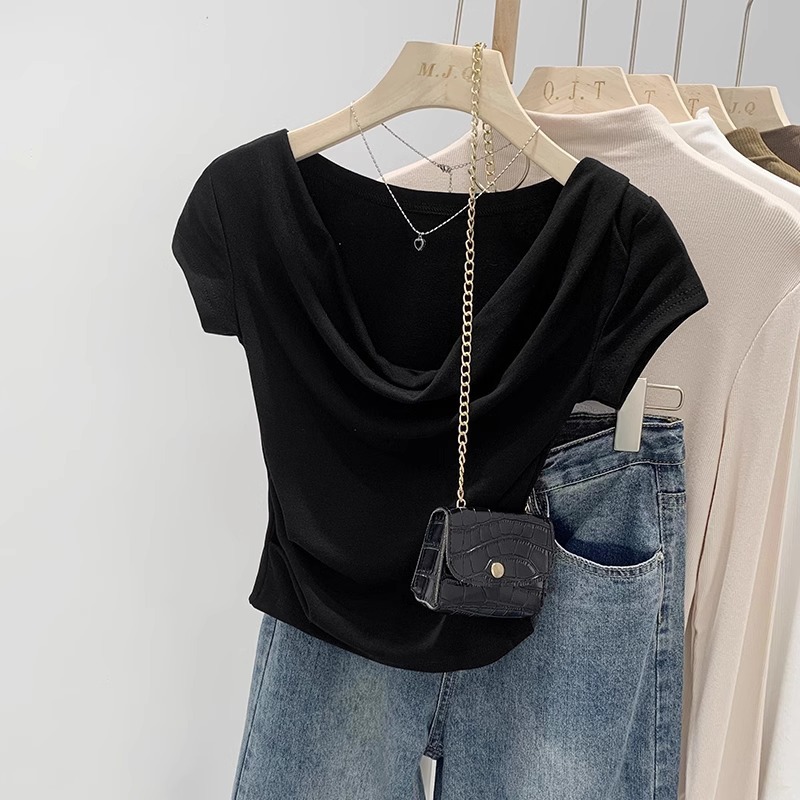 美式辣妹一字肩荡领T恤女夏季小众设计感短上衣粉色短袖