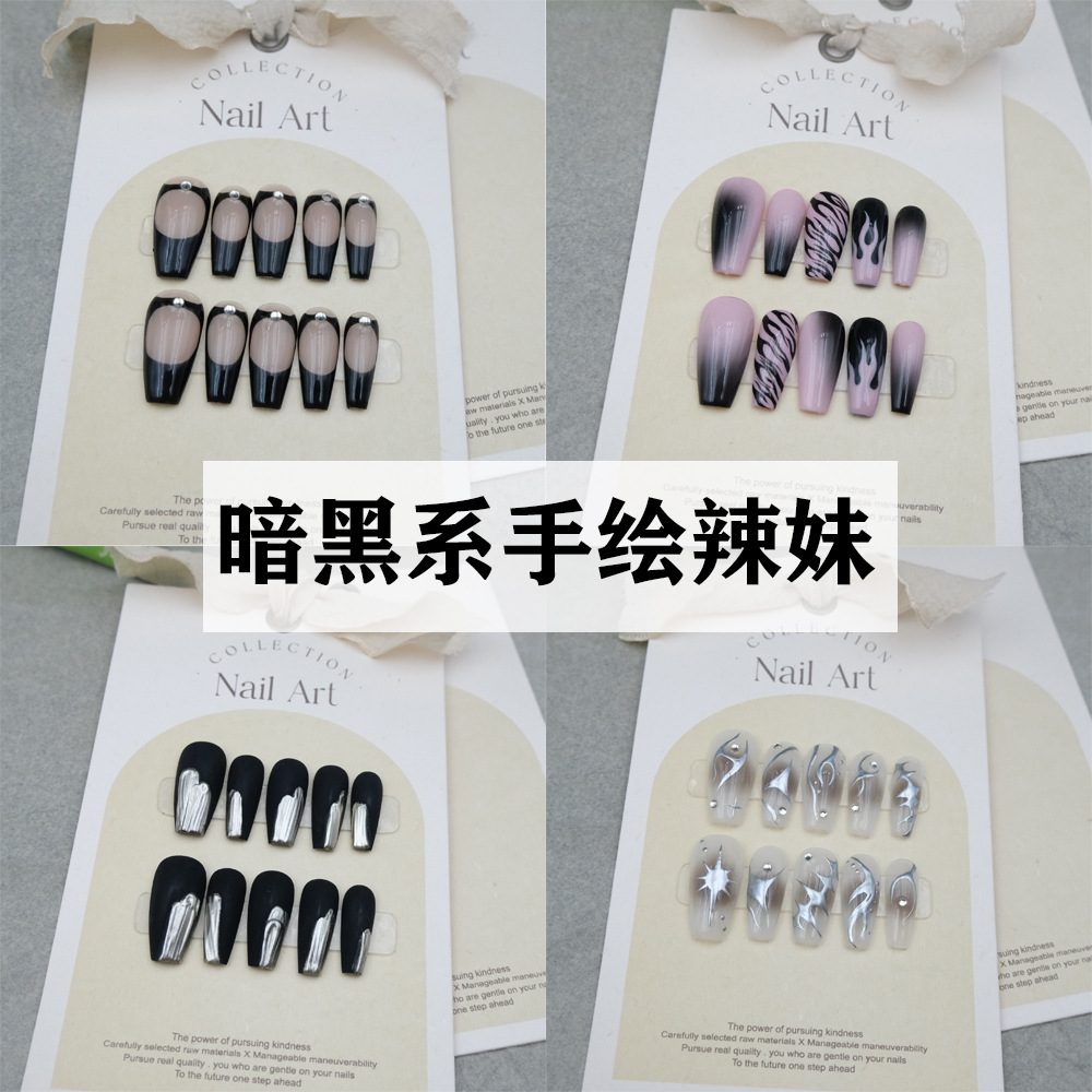 日系暗黑色系手绘辣妹新款合集四季款手工美甲贴片假指甲渐变火焰