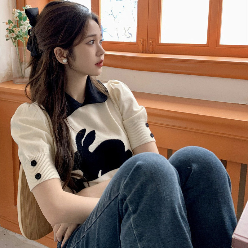 POLO领正肩短袖T恤女夏季减龄冰丝泡泡袖针织衫娃娃领短款上衣服