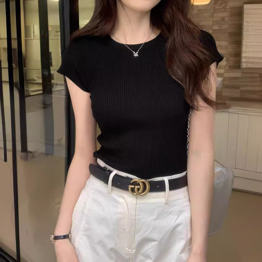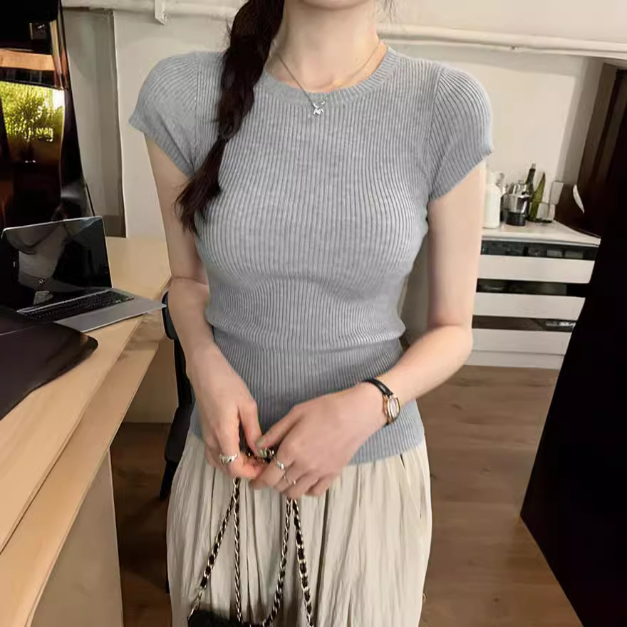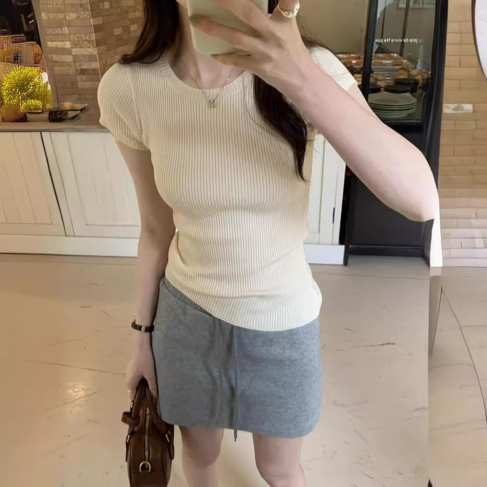 亿涵梦简约百搭短袖T恤女上衣纯色圆领修身显瘦弹性针织衫上衣女