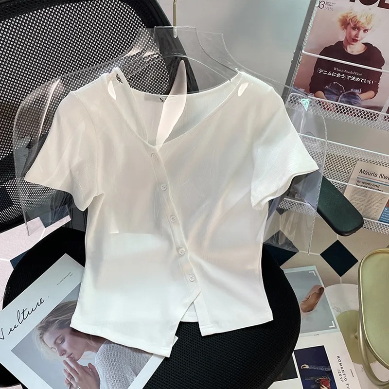 夏季设计感小众独特V领短袖t恤女韩版chic别致不规则短款纯欲上衣