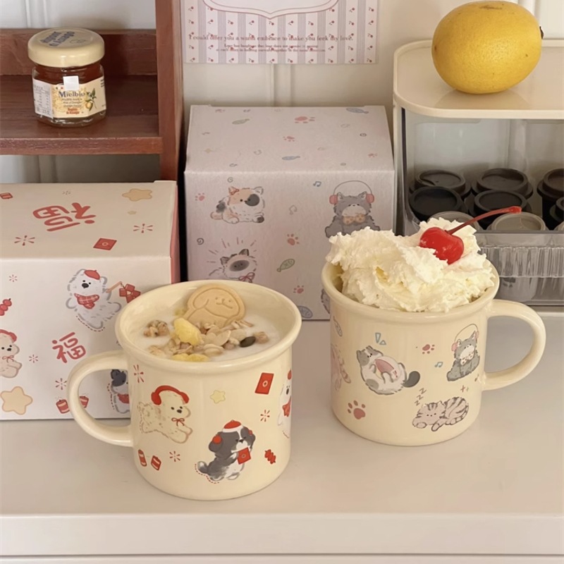 猫狗双全可爱复古家用马克杯办公室奶油色陶瓷咖啡杯情侣杯礼盒装