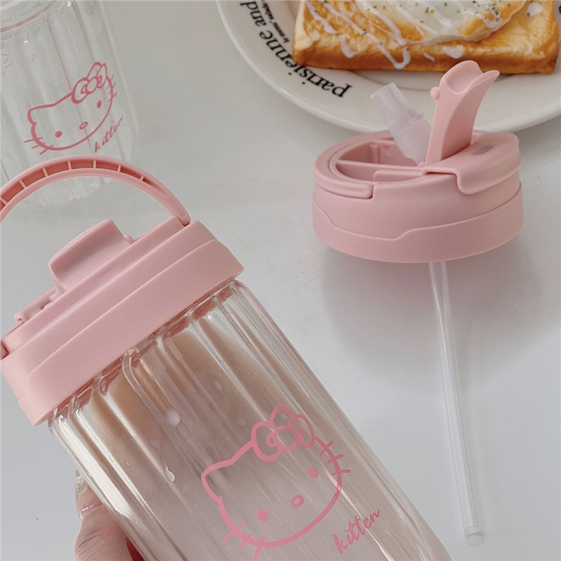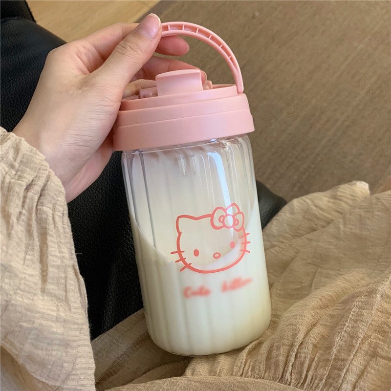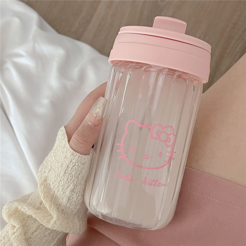 可爱粉色猫咪玻璃杯少女心杯子ins风随身便携带盖手提吸管杯水杯