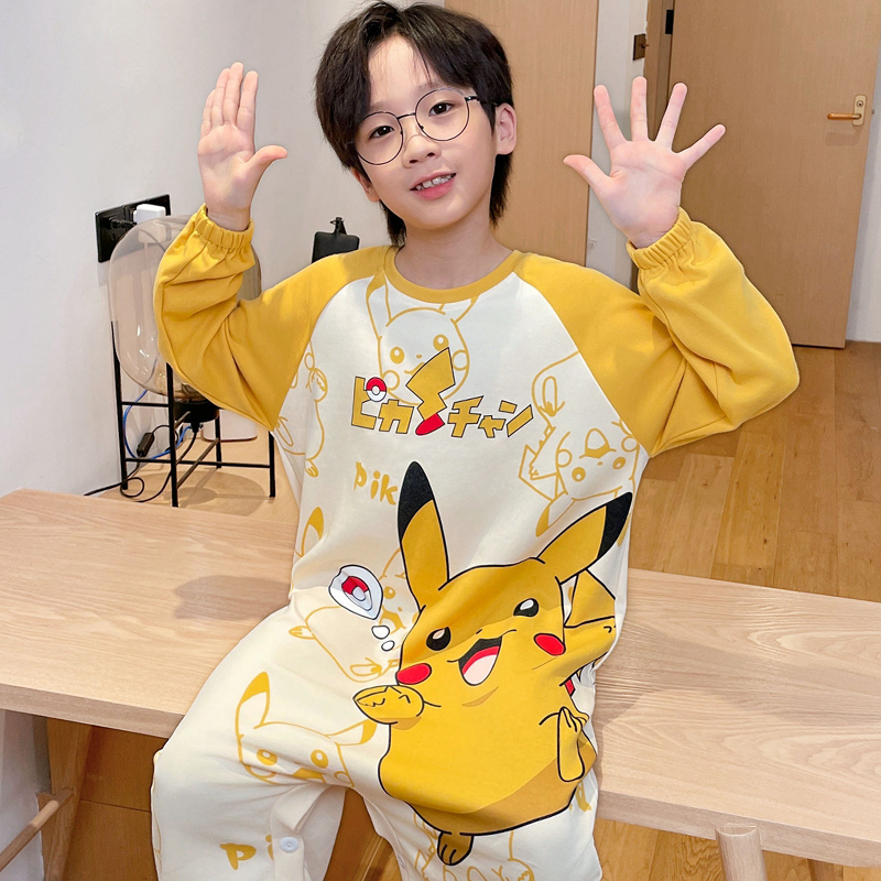 儿童连体睡衣男童宝宝春秋长袖薄款纯棉皮卡丘男孩防踢防着凉连体