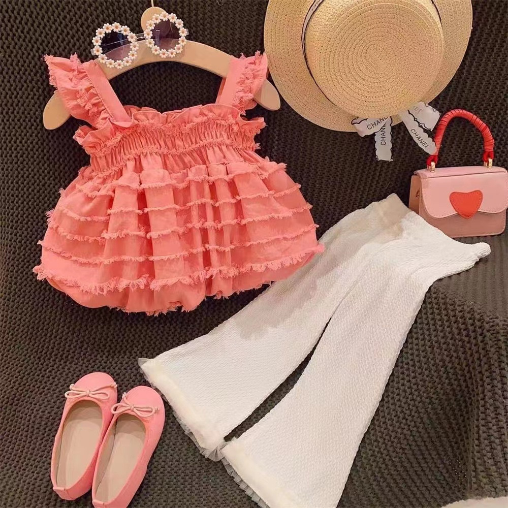 新品女童套装松紧蛋糕吊带娃娃衫蕾丝边休闲裤两件套2025夏装