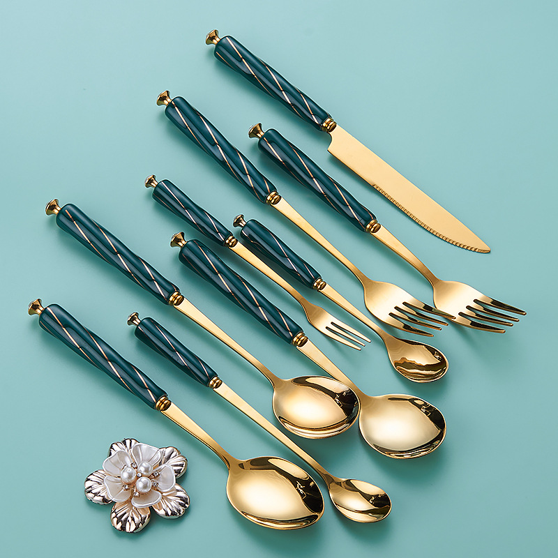 不锈钢餐具刀叉勺创意陶瓷不锈钢咖啡勺水果叉墨绿色刀叉勺