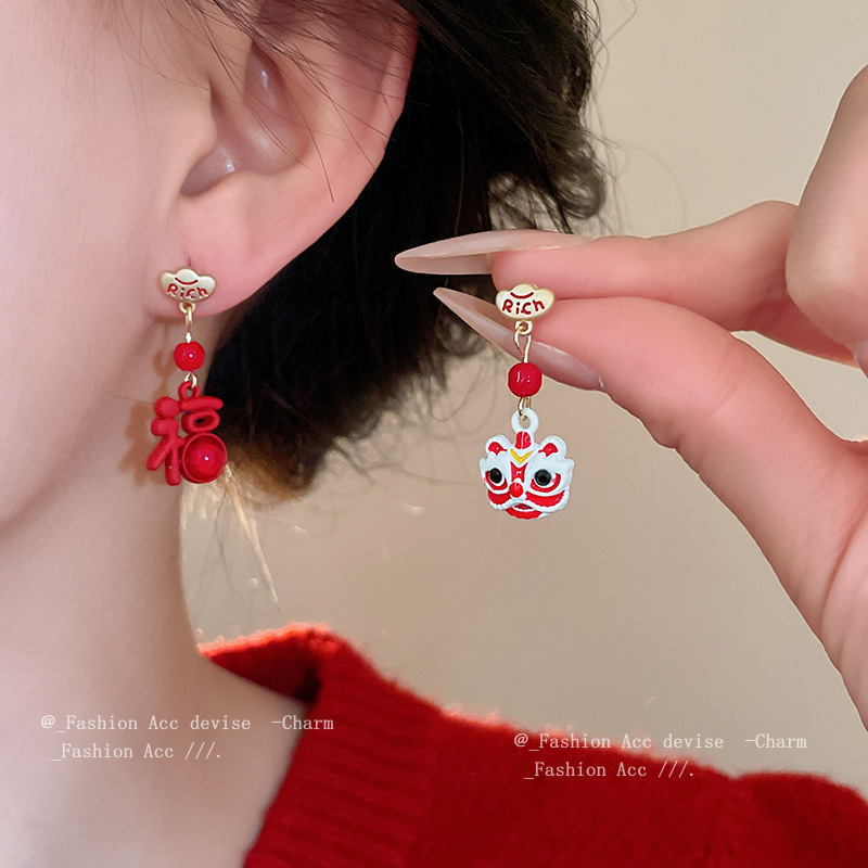 银针滴油元宝醒狮福字吊坠耳钉时尚红色喜庆耳环气质百搭新年耳饰