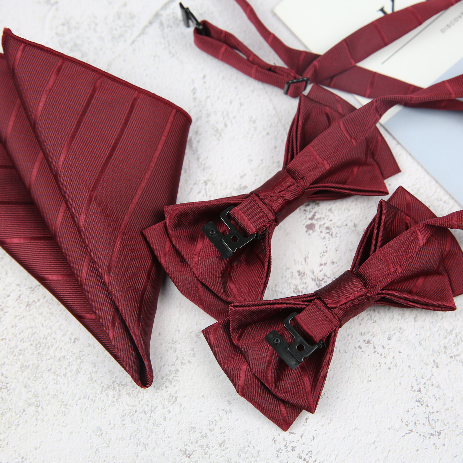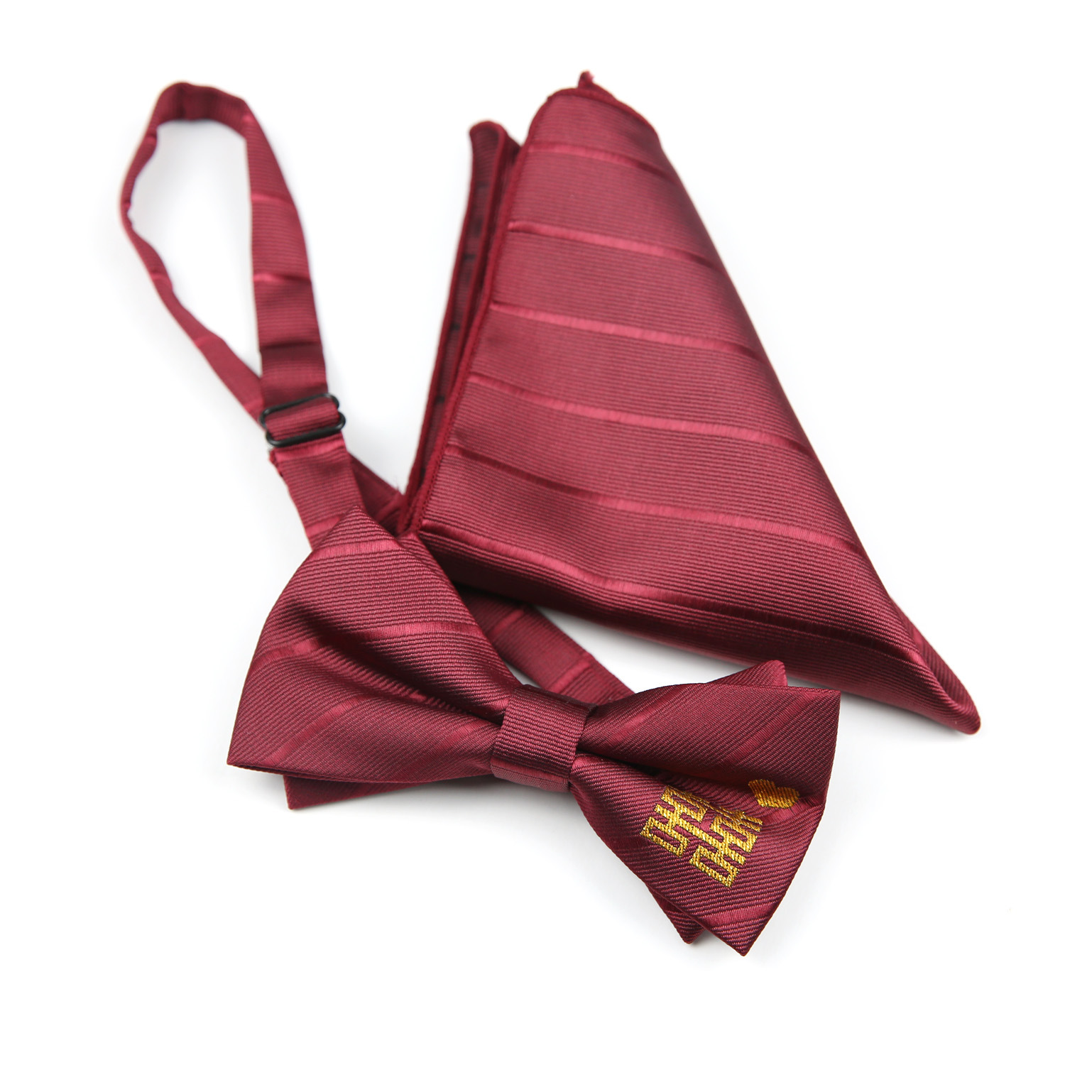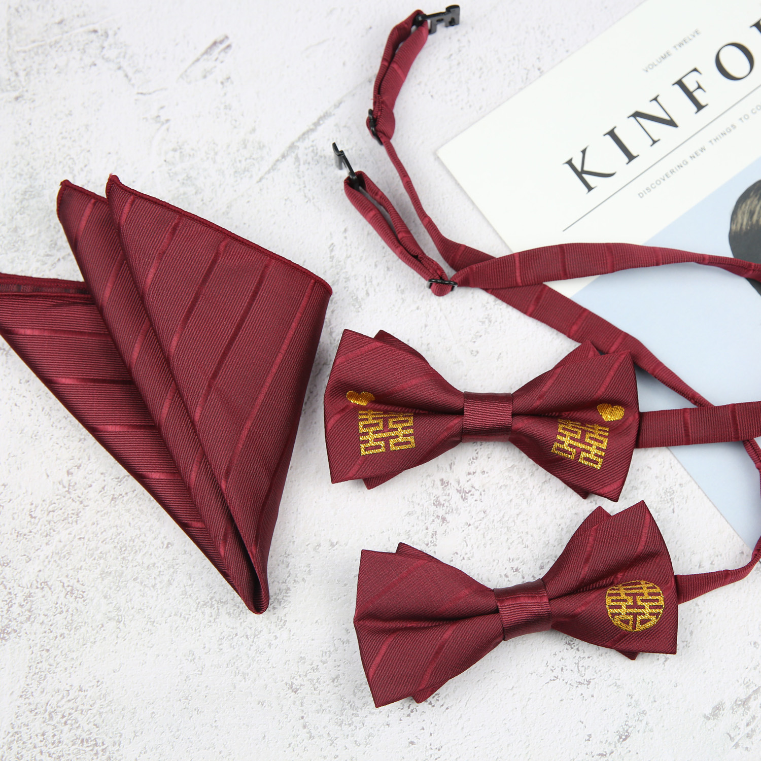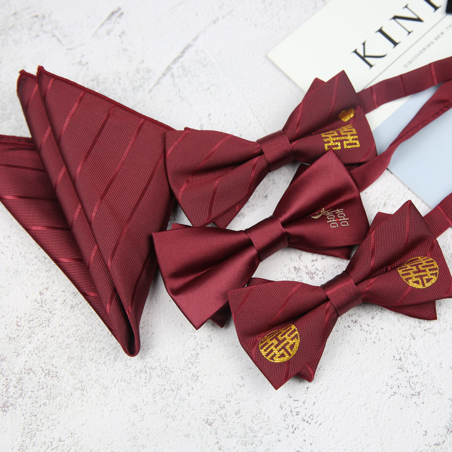 男士喜字领结口袋巾两件套 结婚婚礼新郎西装酒红色婚庆蝴蝶结