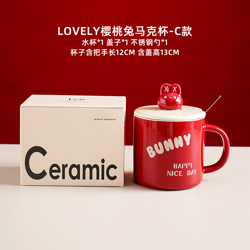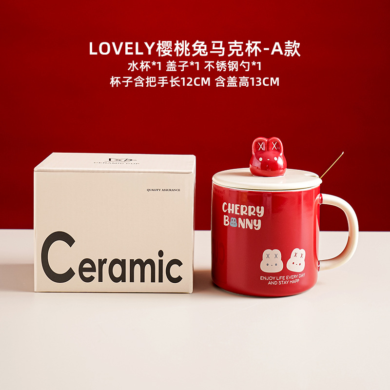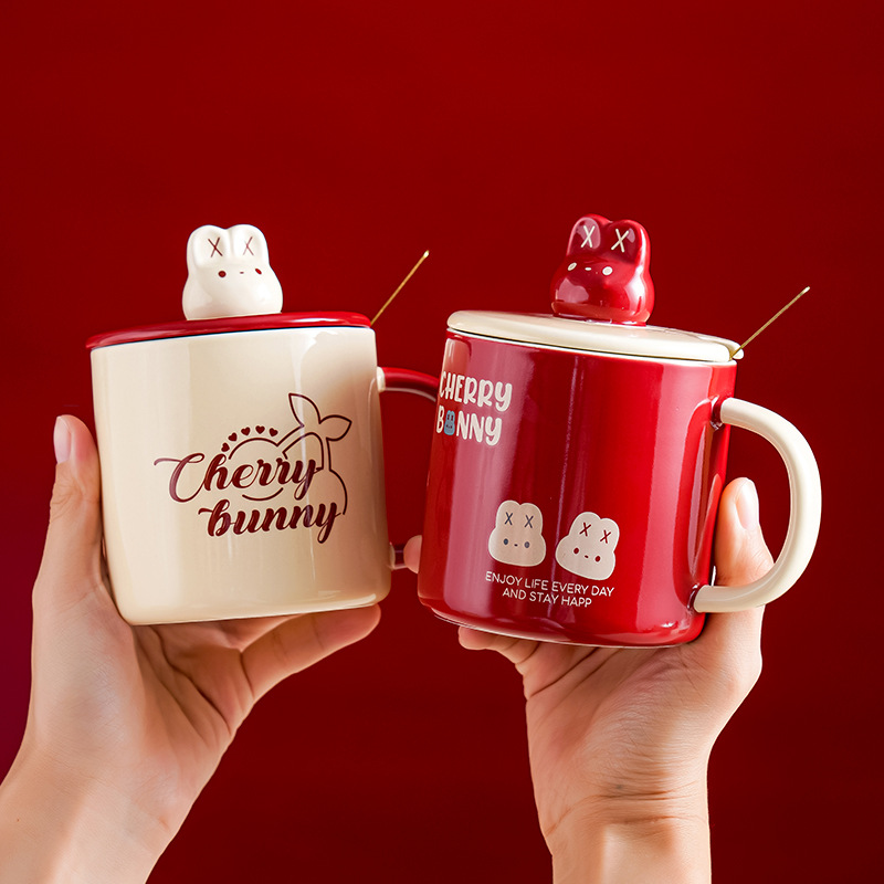 樱桃兔喜庆水杯耐高温马克杯家用办公室陶瓷水杯情侣对杯礼盒装