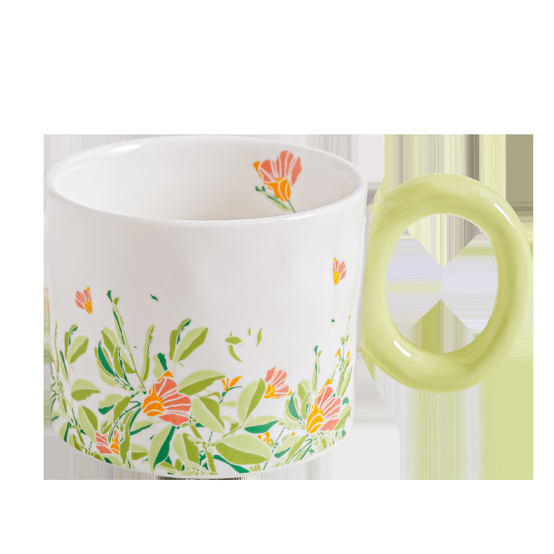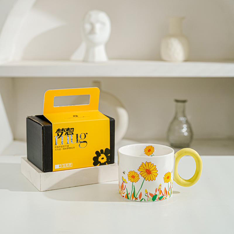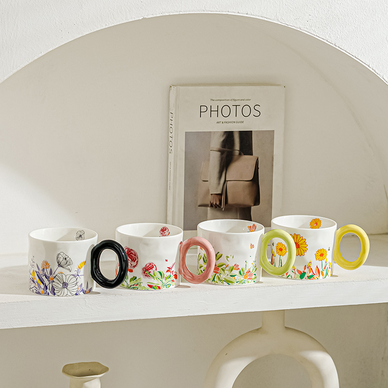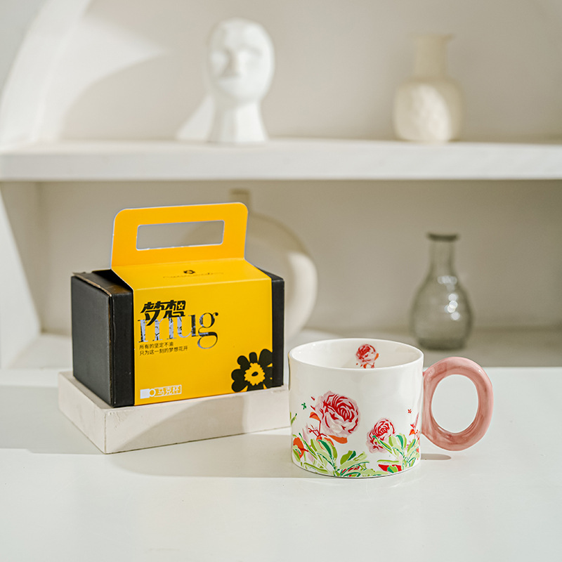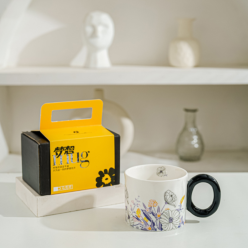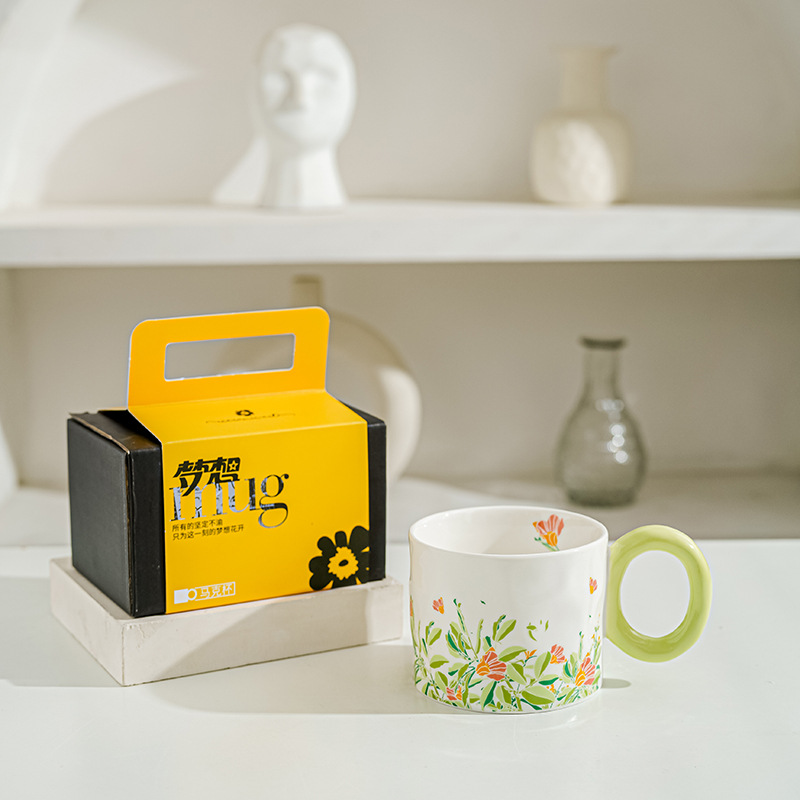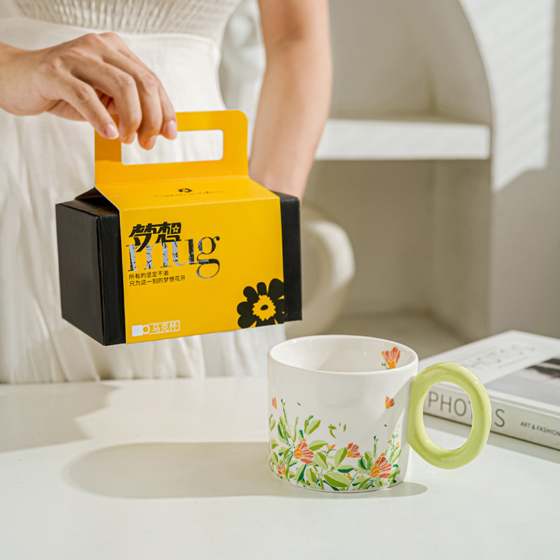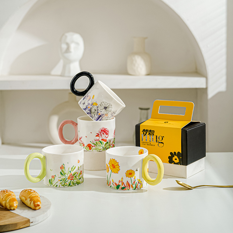 创意手绘花朵马克杯家用北欧高颜值陶瓷杯节日活动伴手礼礼盒装