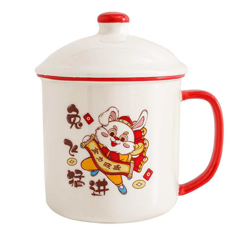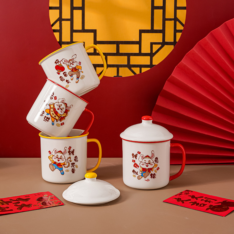 国潮卡通兔搪瓷杯陶瓷杯办公室带盖水杯伴手礼马克杯礼套装