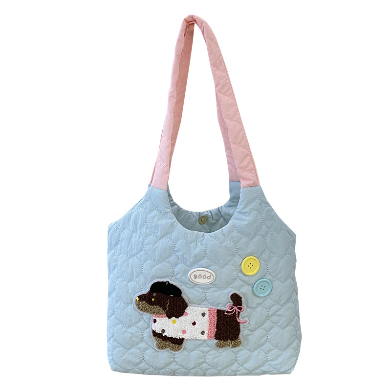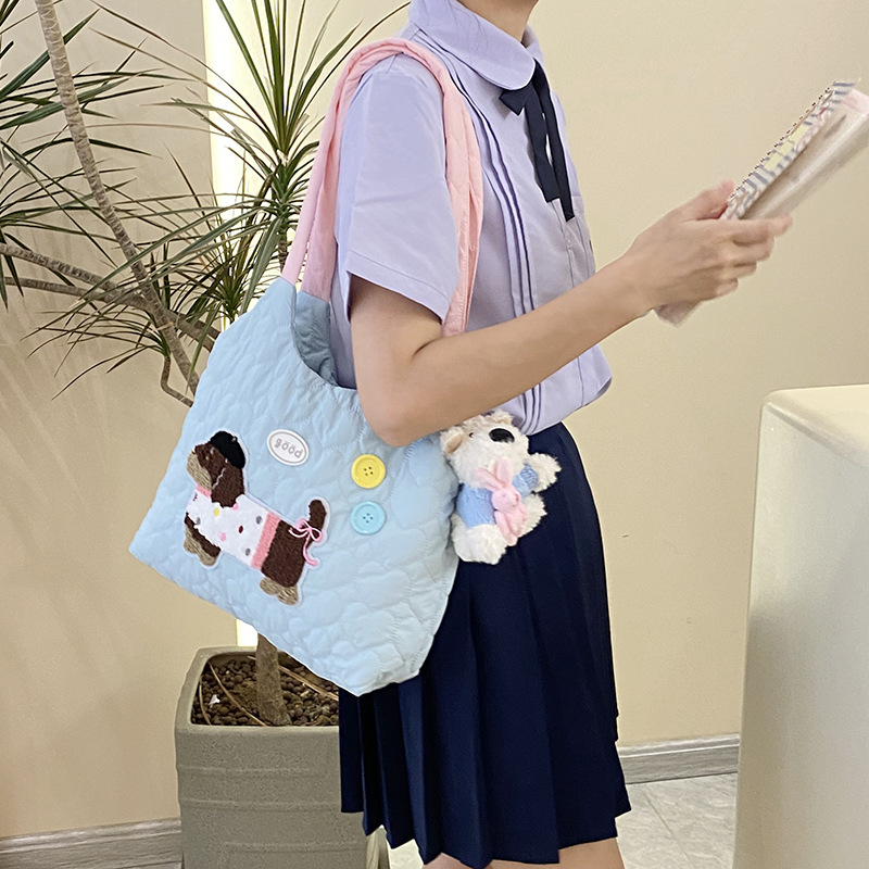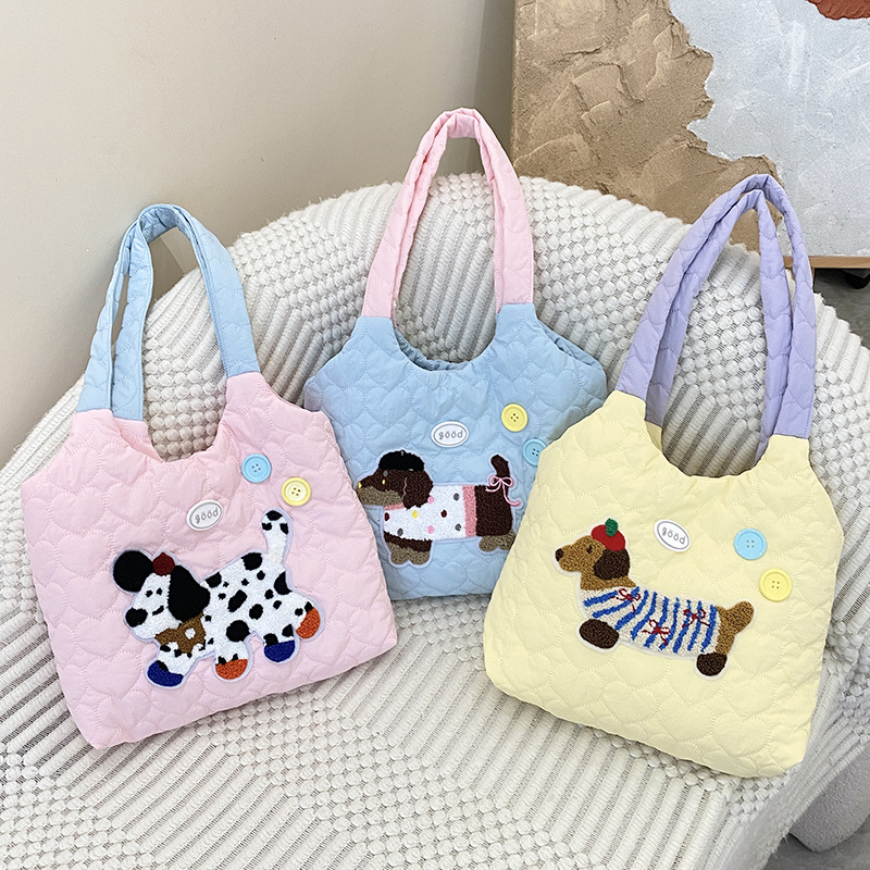 新款绗缝单肩包可爱小狗刺绣撞色肩带帆布包大容量学生上课通勤包