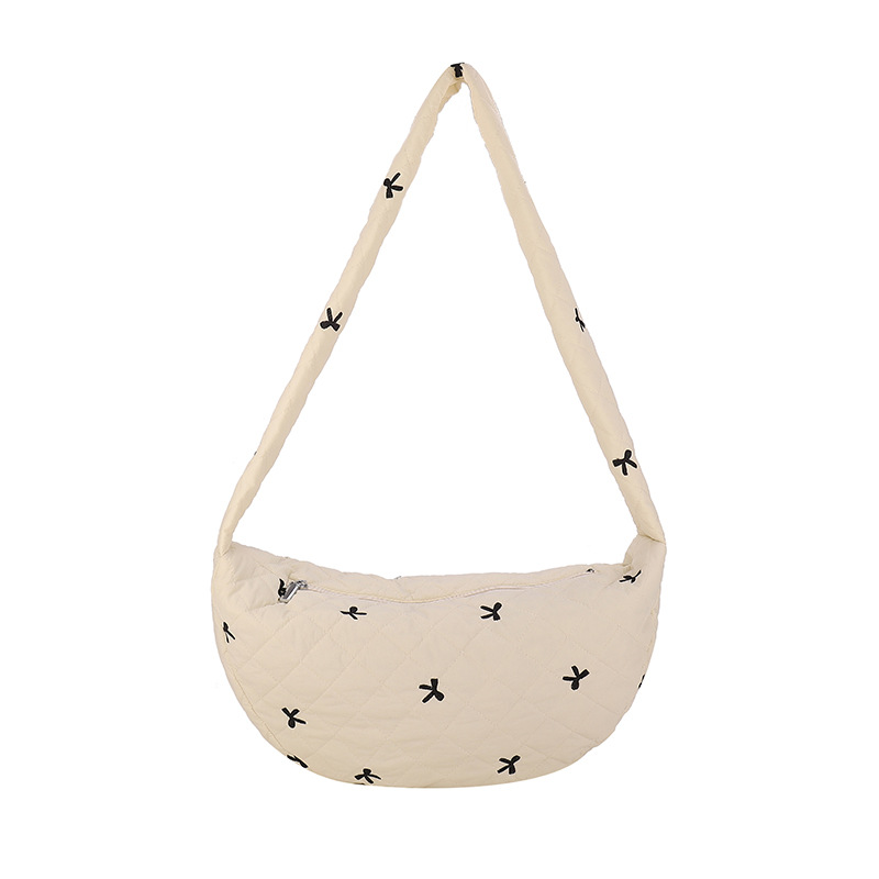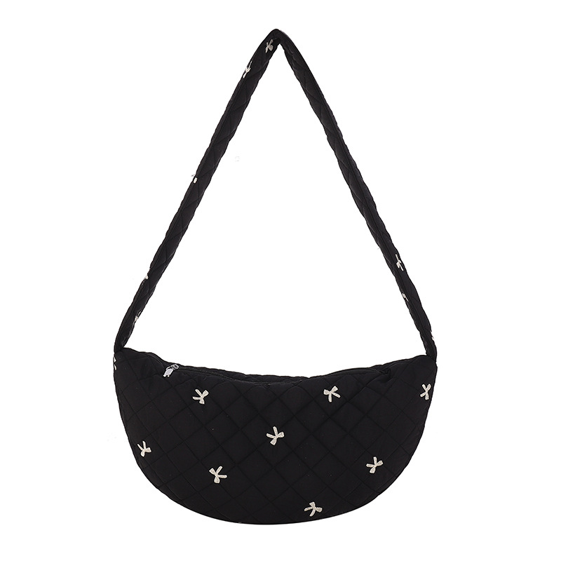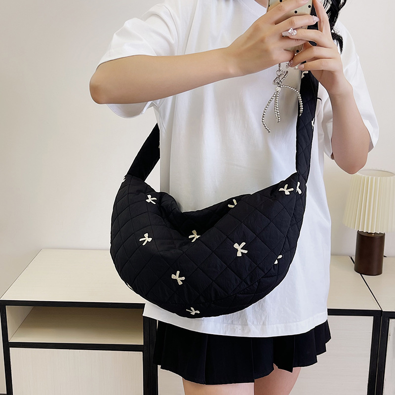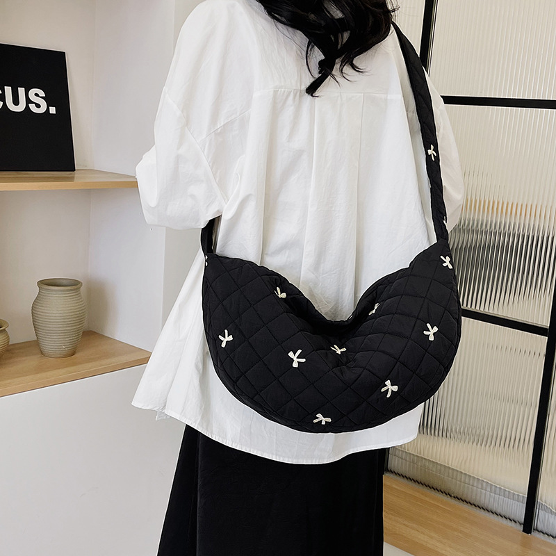 新款菱格棉服包包清新甜美刺绣蝴蝶结斜挎包时尚休闲大容量饺子包