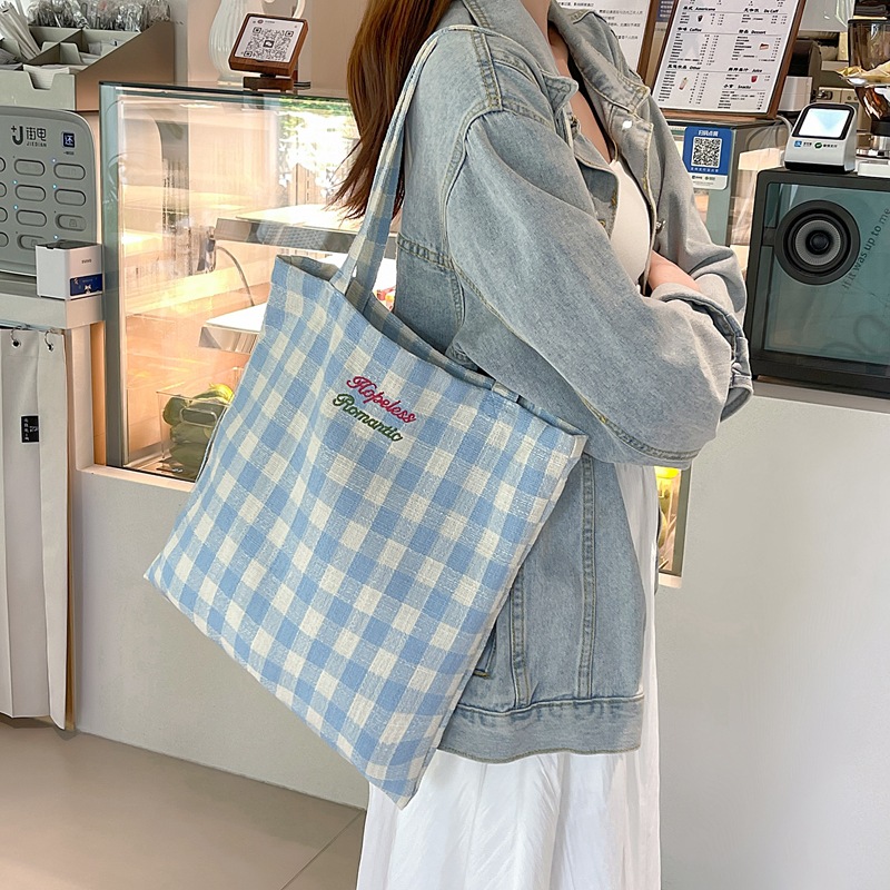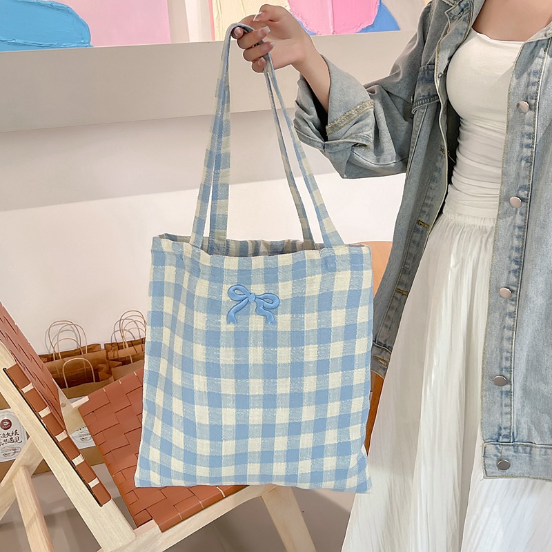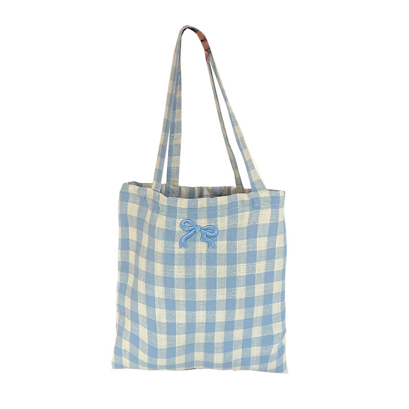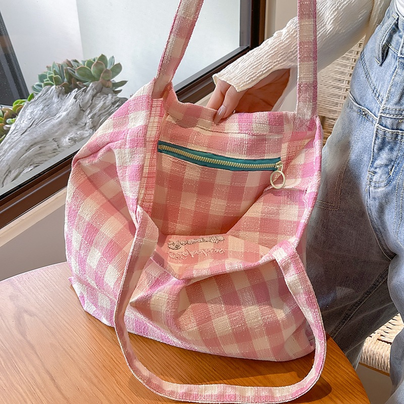 温柔撞色格纹休闲帆布包夏季新款小清新大容量双面背两用单肩包