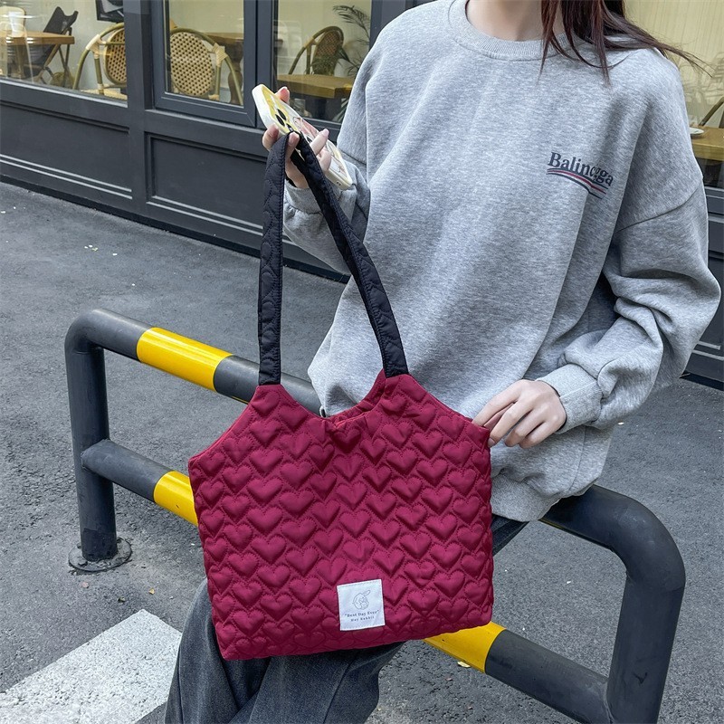 MAY RABBIT爱心绗缝单肩包大容量帆布包撞色腋下包学生上课包布包