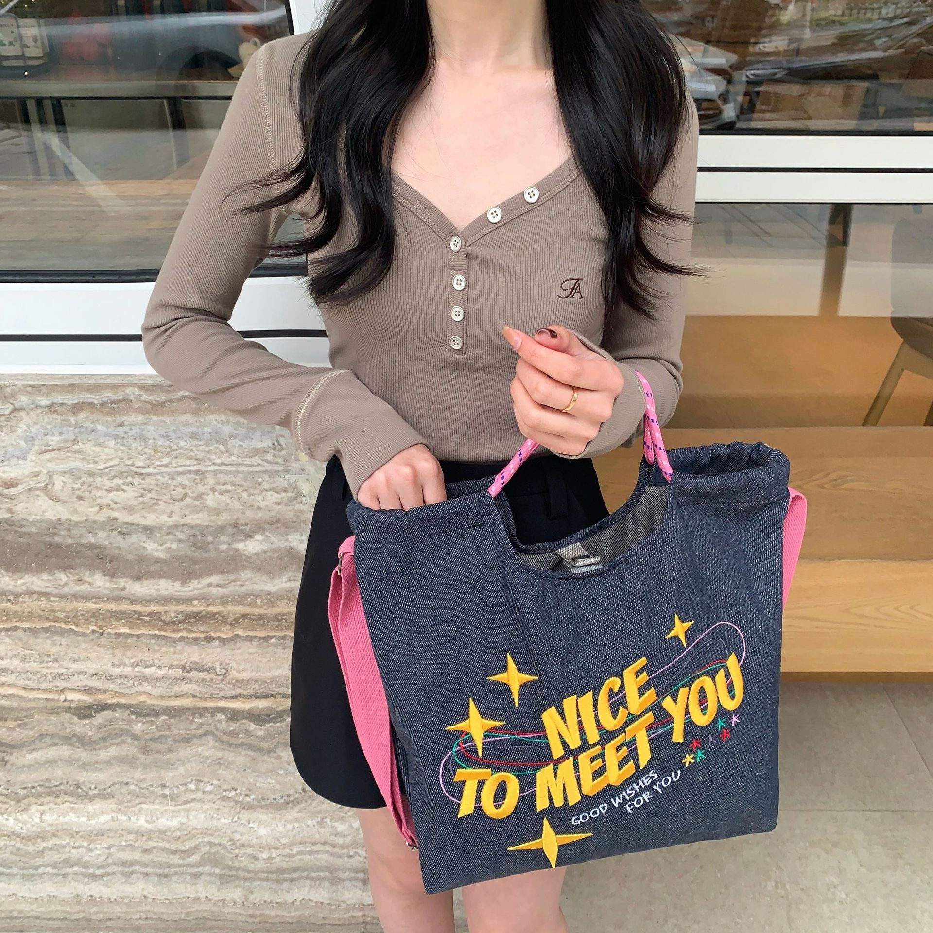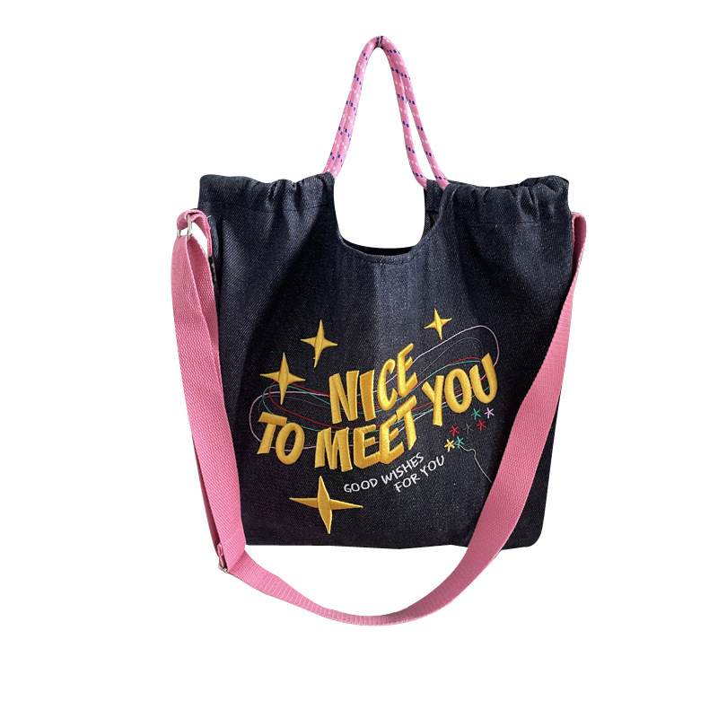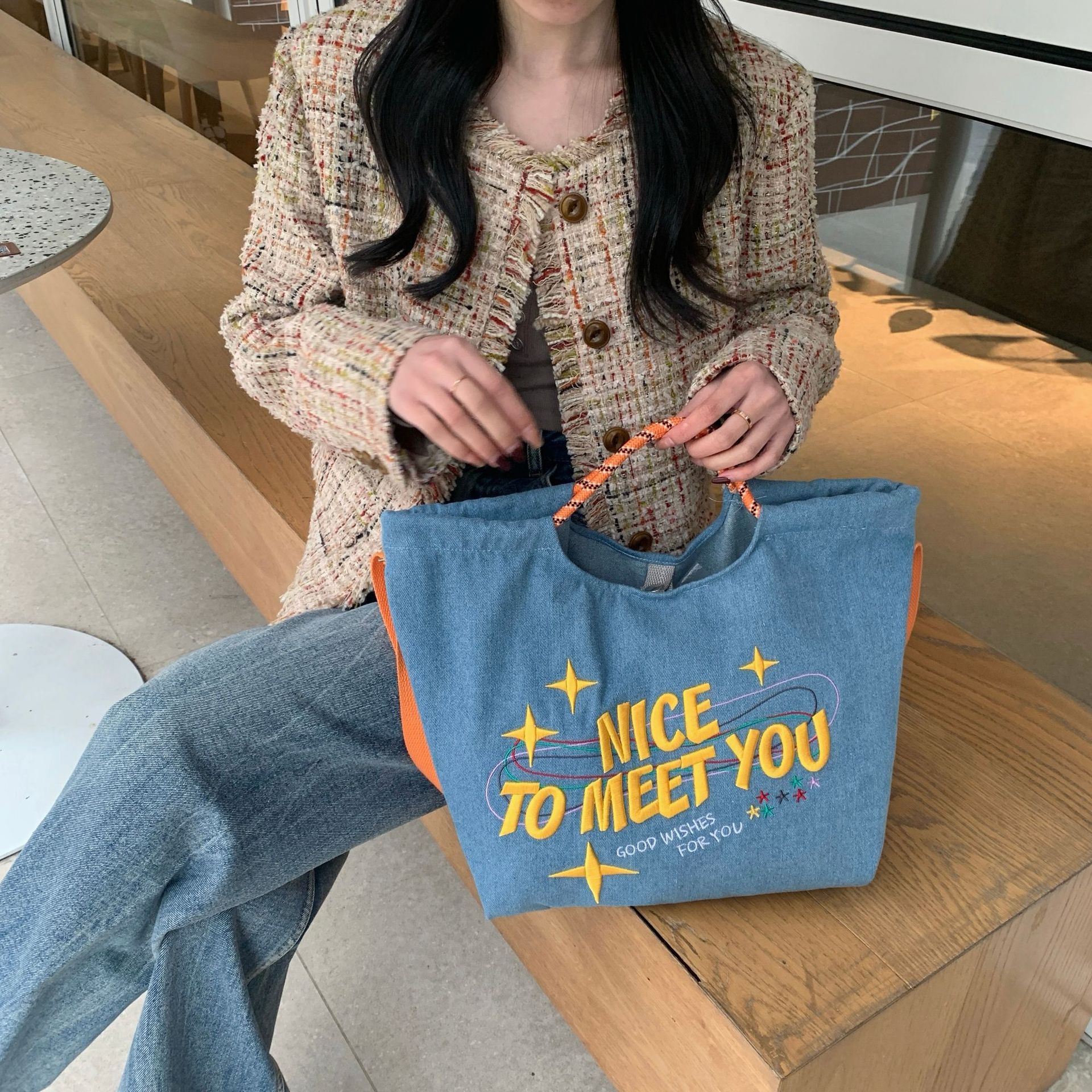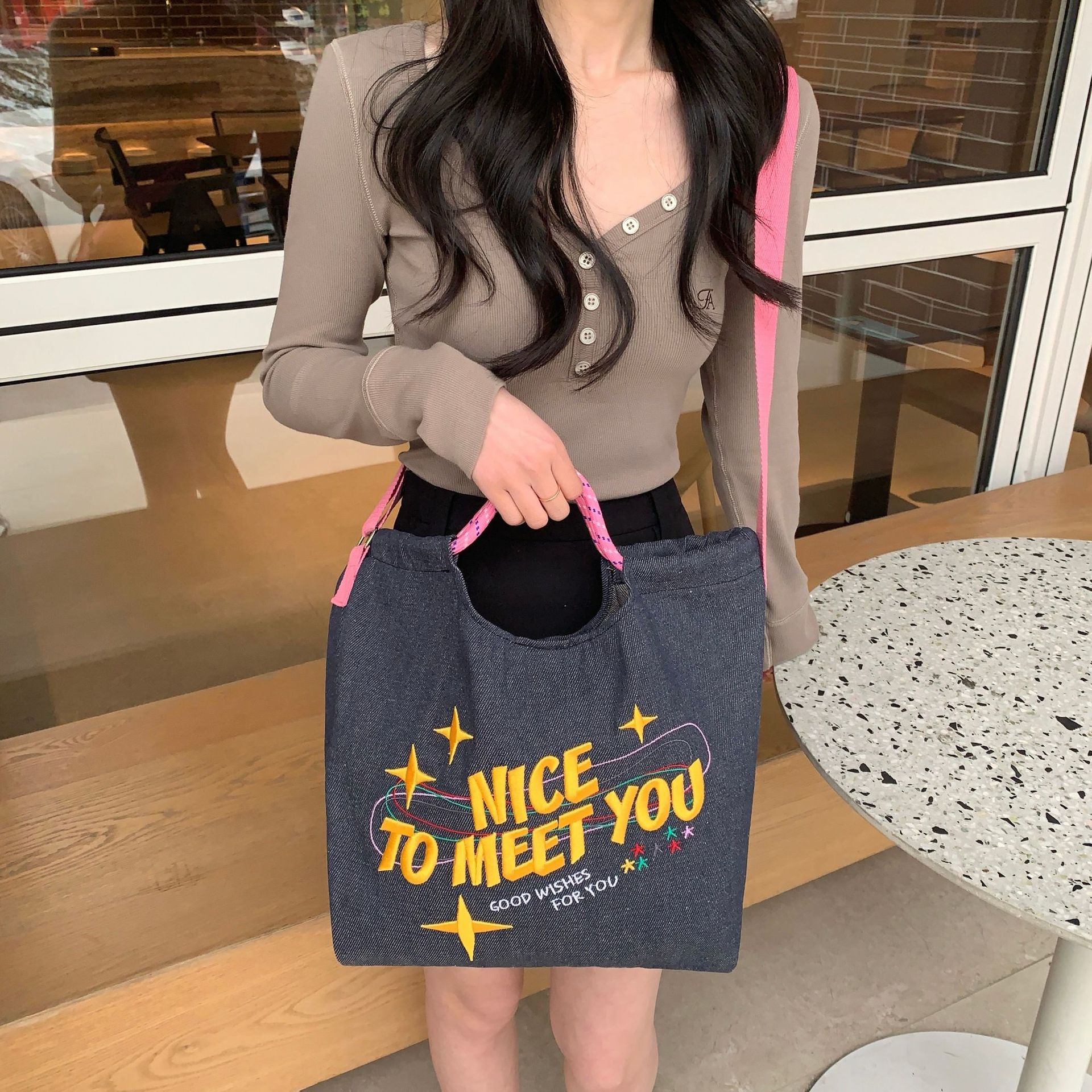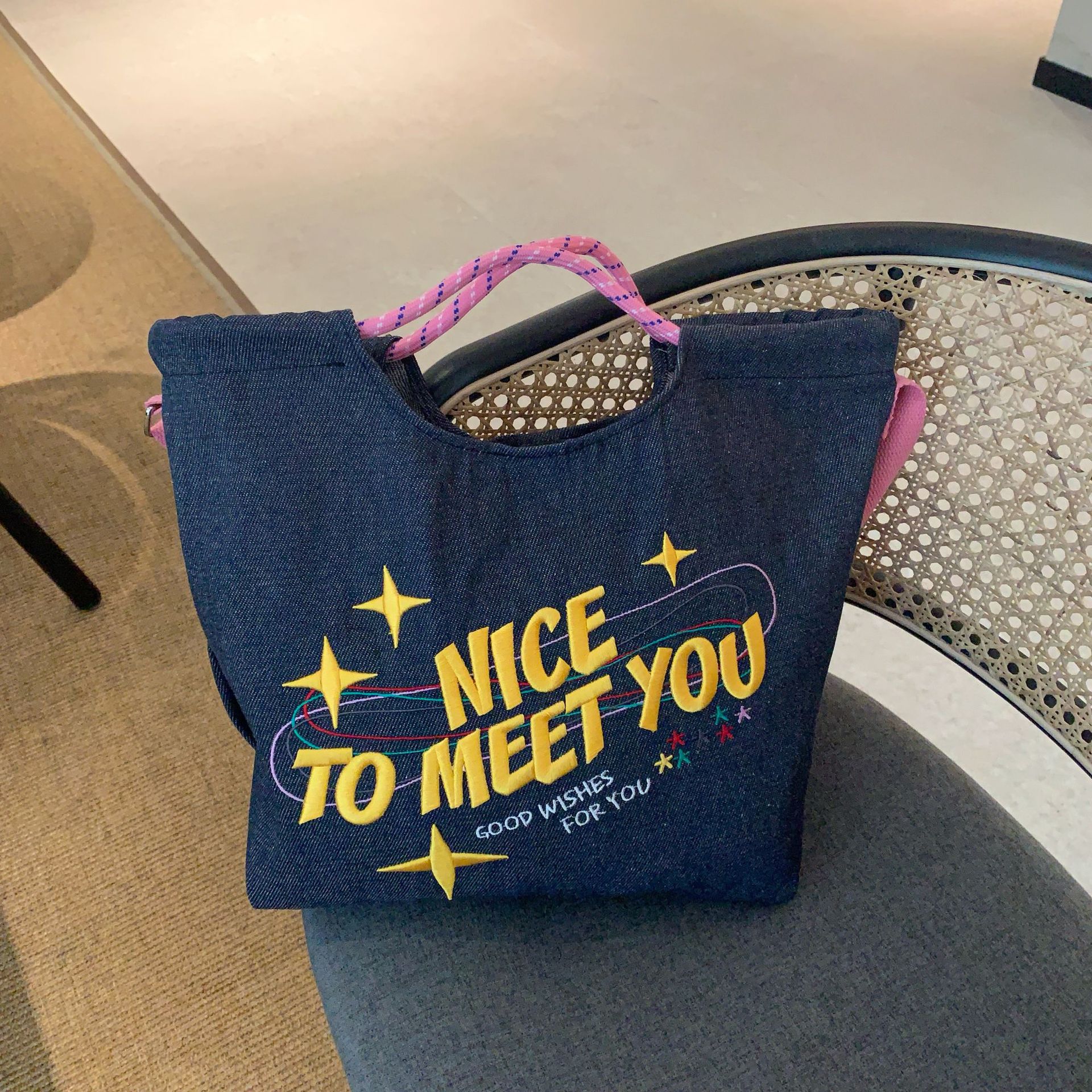 新款文艺简约百搭牛仔斜挎手提肩带可调节学生发泡印花单肩包