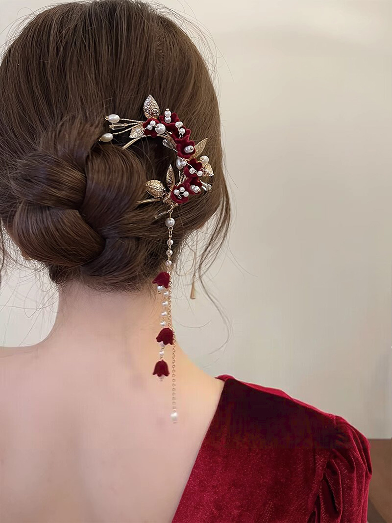 囍~精致红色流苏U发簪女古风高级感盘发新娘头饰品新中式旗袍簪子