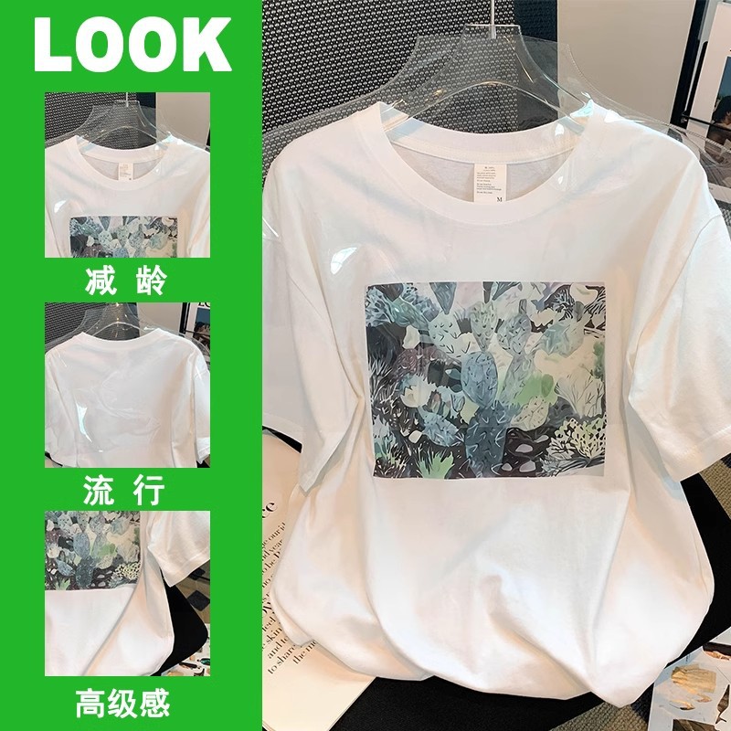 胖mm大码宽松印花短袖t恤女夏季新款设计感小众甜酷纯棉t桖上衣潮