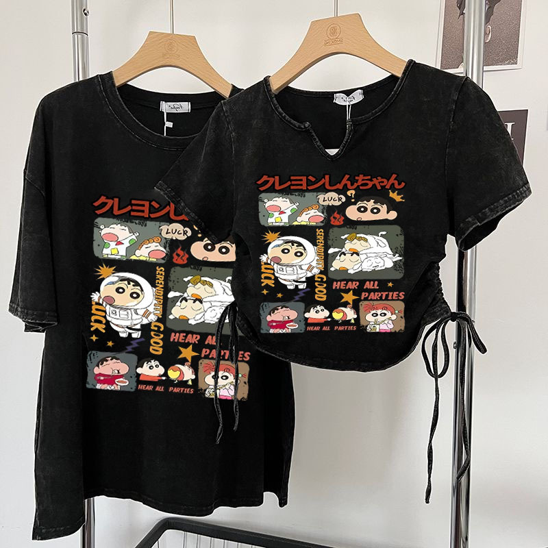 美式高街复古情侣装洗水做旧短款辣妹t恤女夏设计感小众抽绳上衣