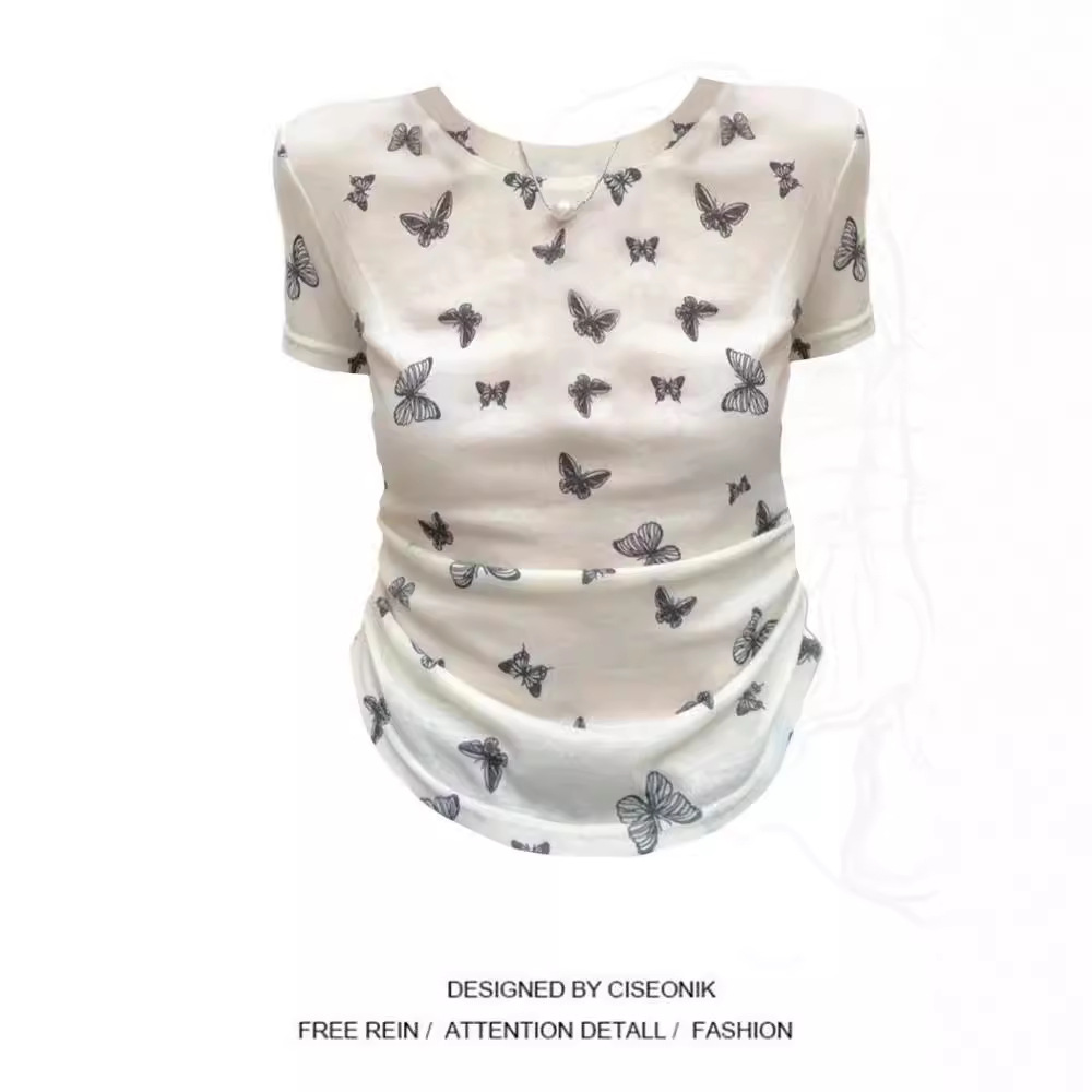 蝴蝶正肩印花圆领夏季修身纯欲T恤设计显瘦打底短款短袖上衣
