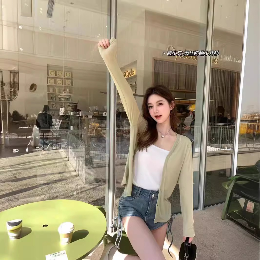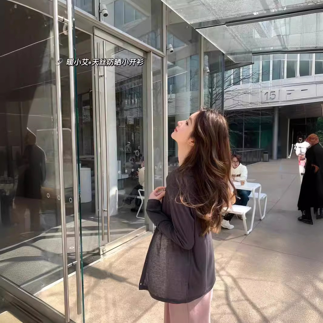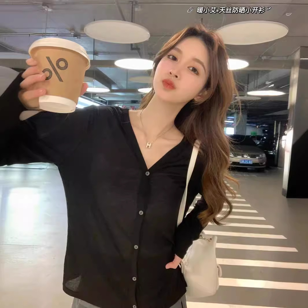 日系新款天丝开衫女长袖夏季薄款吊带外搭罩衫V领空调衫上衣