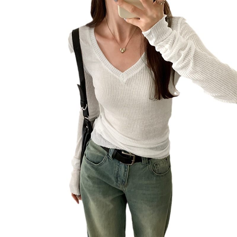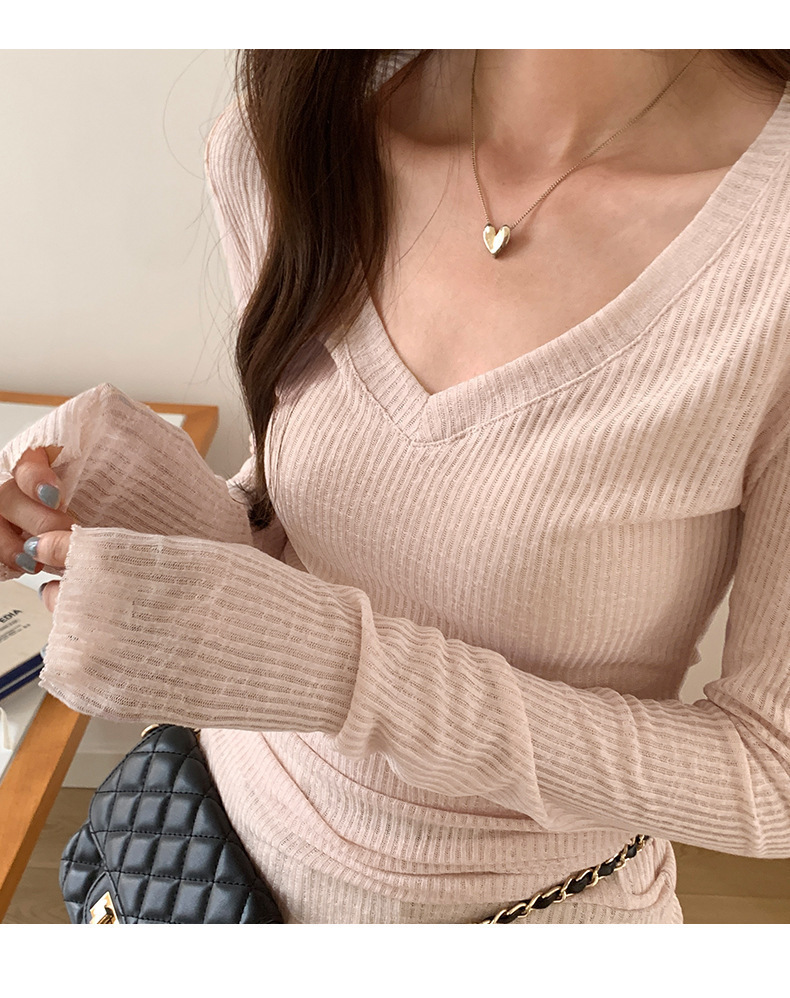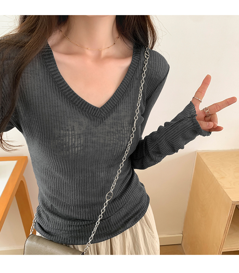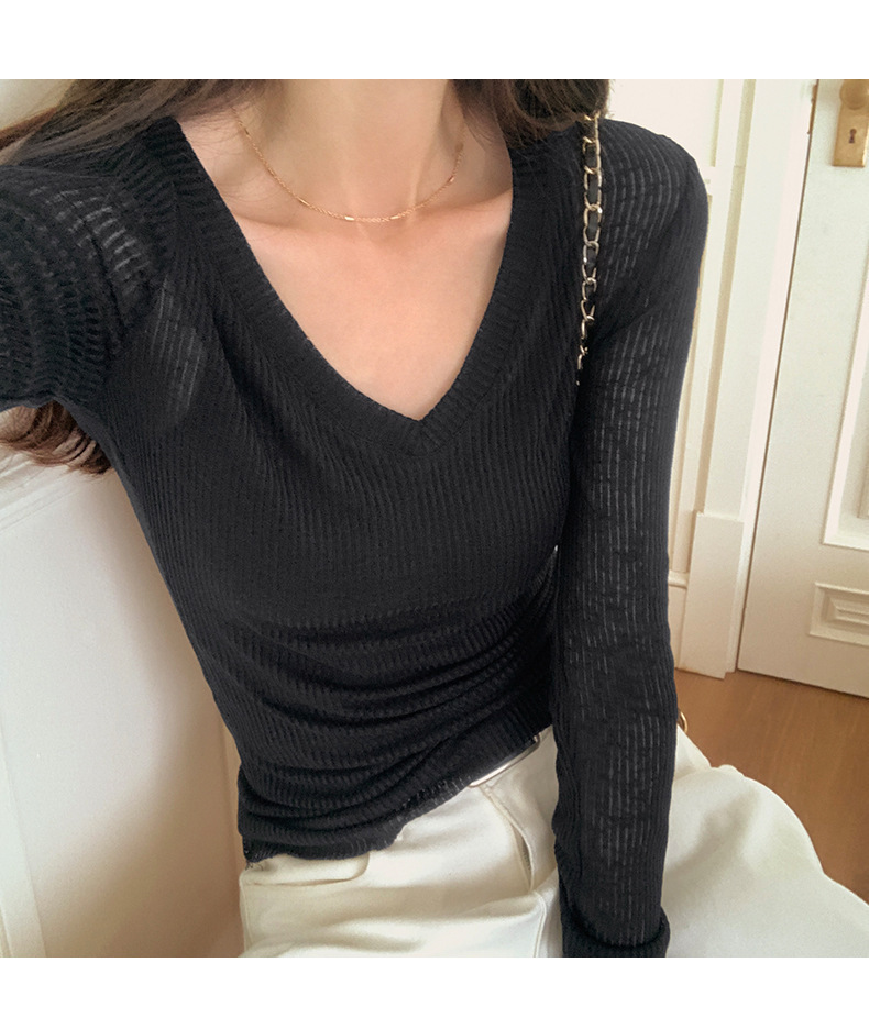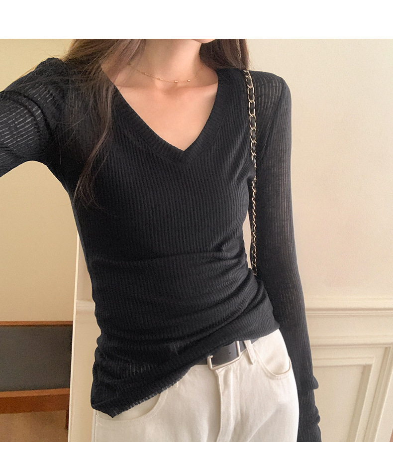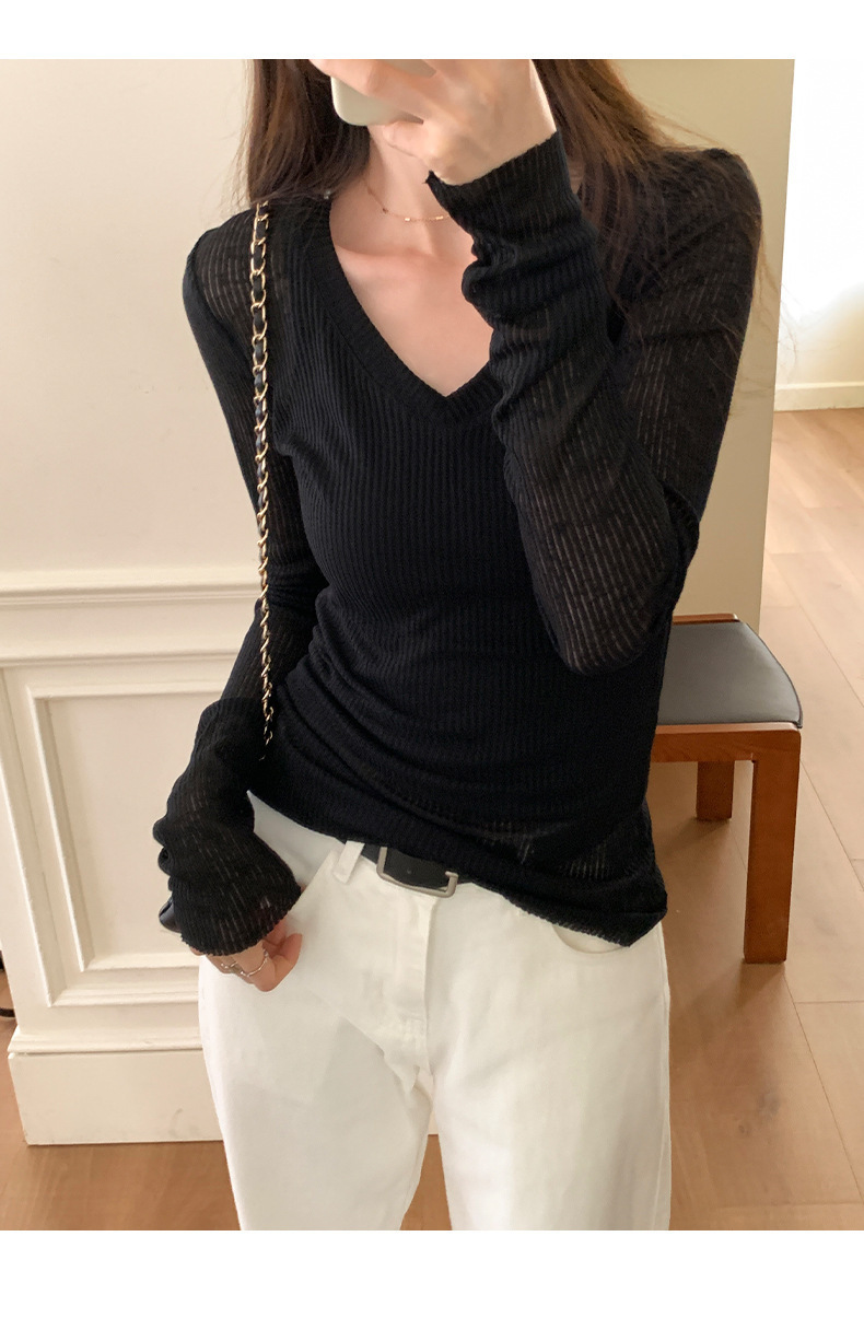 春夏新款美式v领薄款修身显瘦长袖女纯欲风设计感微透罩衫可外穿