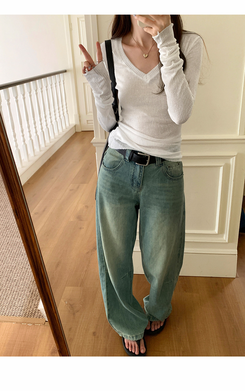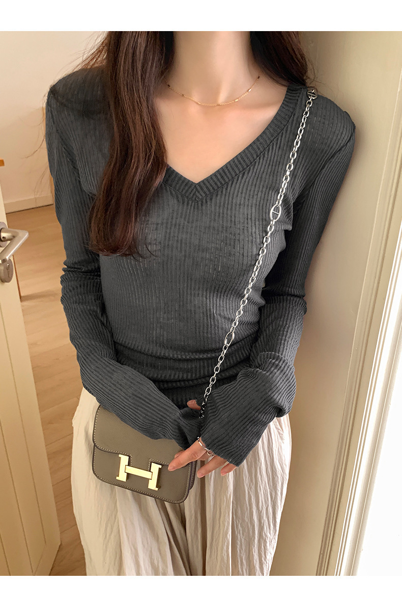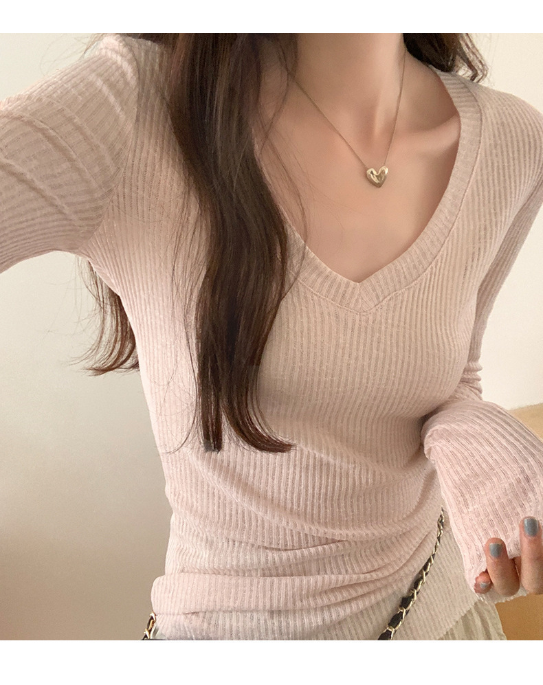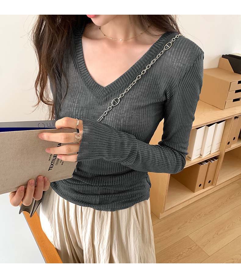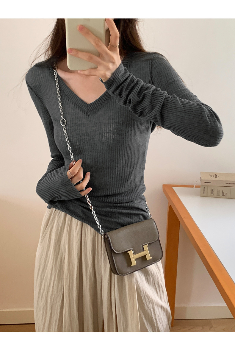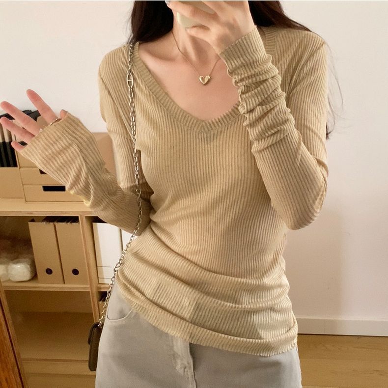 春夏新款美式v领薄款修身显瘦长袖女纯欲风设计感微透罩衫可外穿