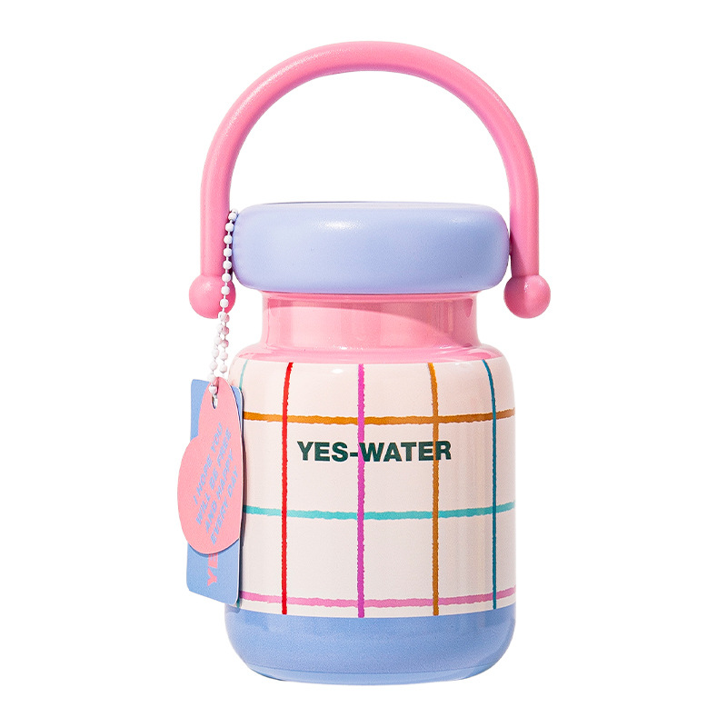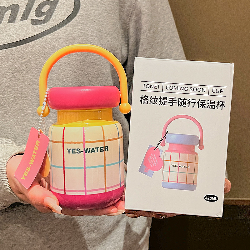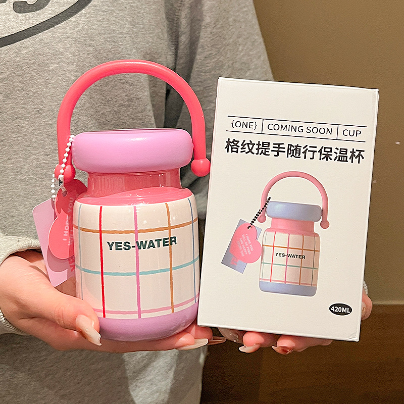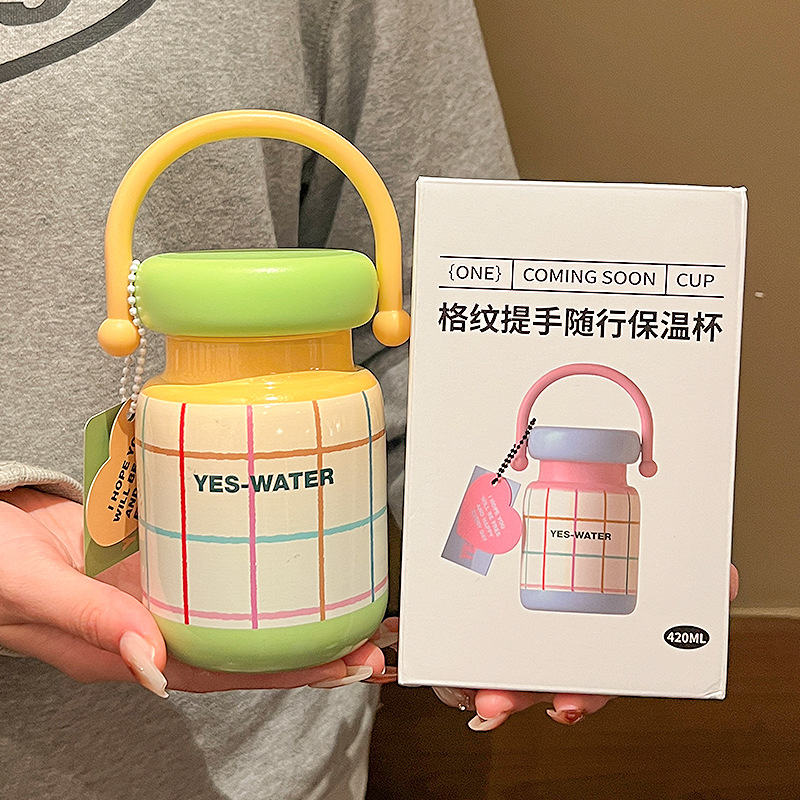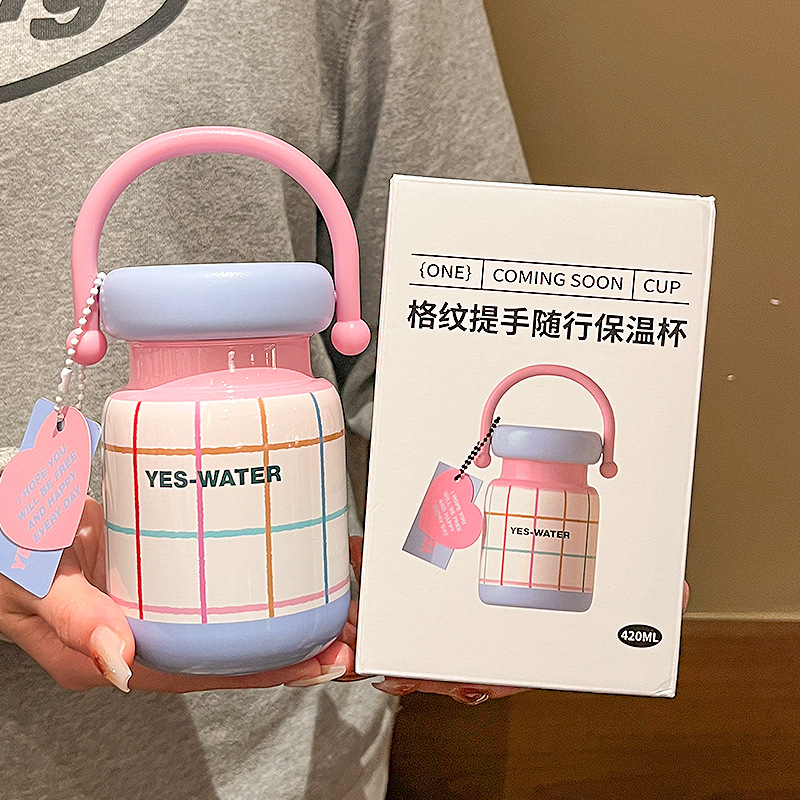 格纹提手随行保温杯女高颜值小清新学生便携不锈钢保温杯上学水杯