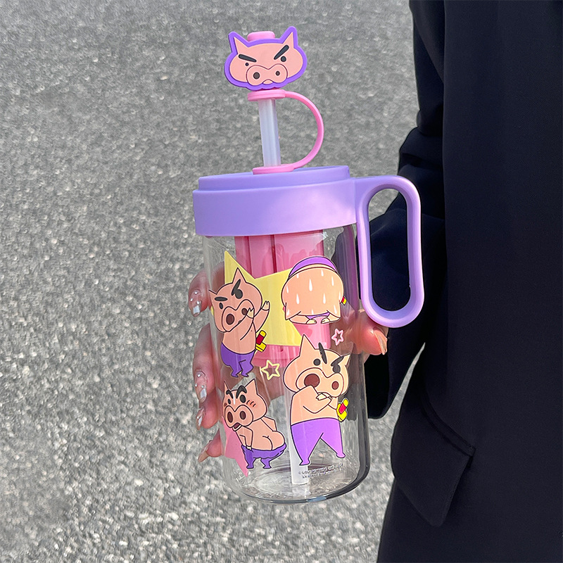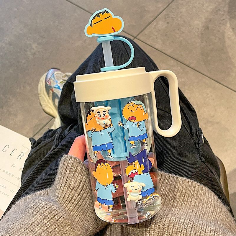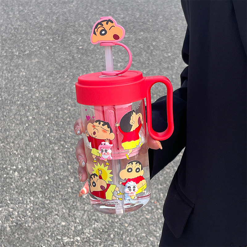 蜡笔小新玻璃水杯高颜值夏季茶水分离吸管杯耐高温学生杯子带茶隔