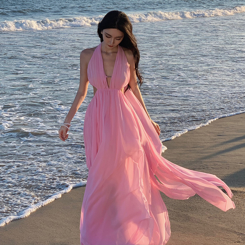 法式绝美粉色仙女飘带挂脖连衣裙女夏季浪漫镂空开叉度假沙滩长裙