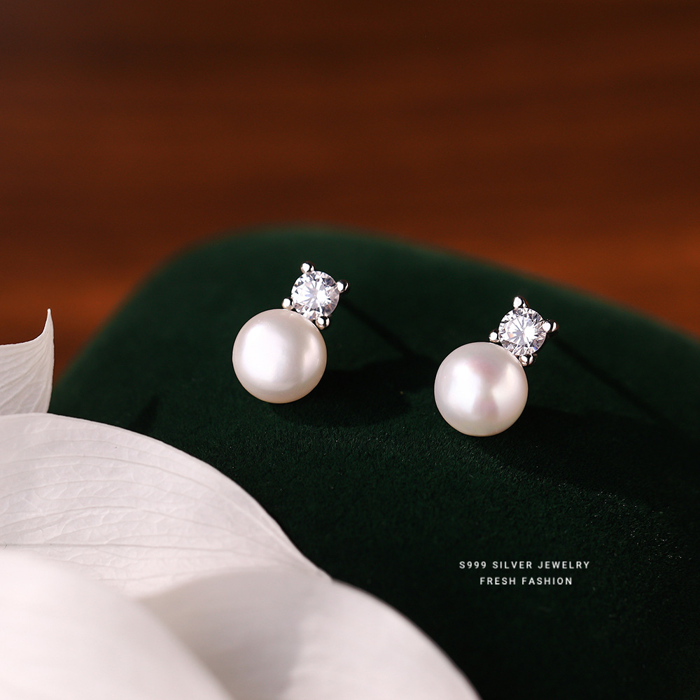 s999足银锆石淡水珍珠耳钉女法式复古轻奢气质小众高级感设计耳饰