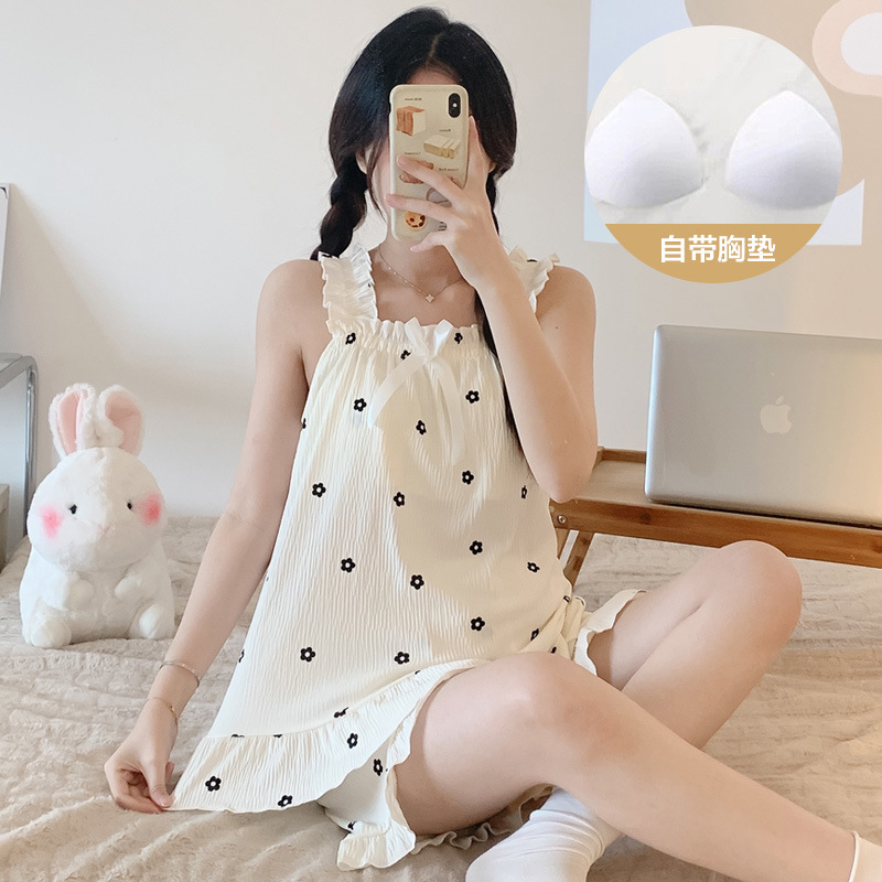 夏季无袖背心吊带短裤睡衣女士甜美仿棉皱布带胸垫宽松休闲可外穿
