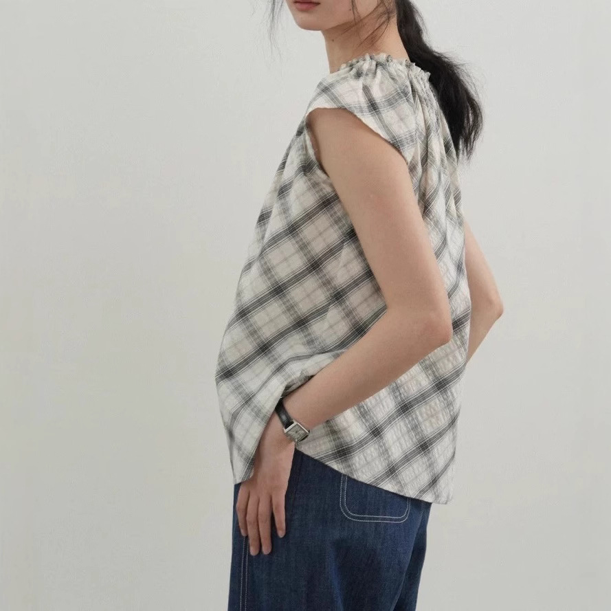 法式复古黑白格子减龄小衫短款小飞袖独特别致上衣女夏季新款