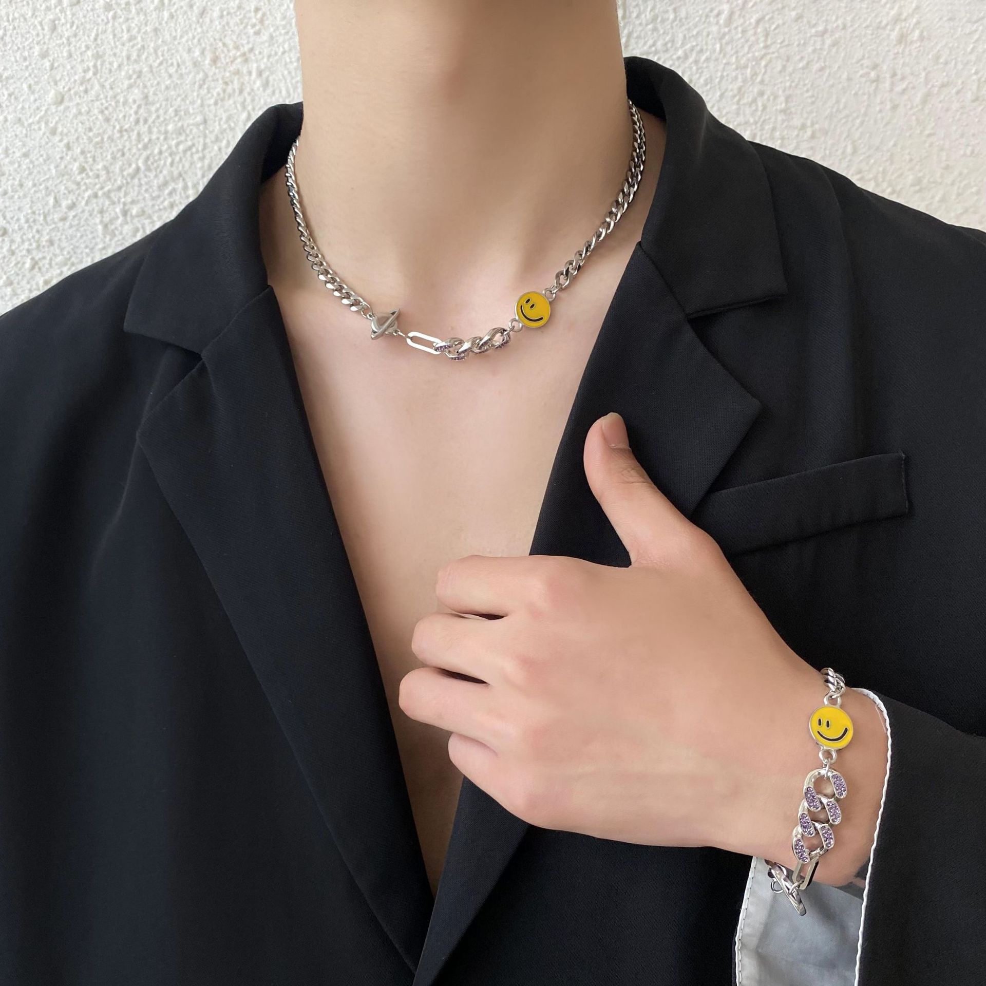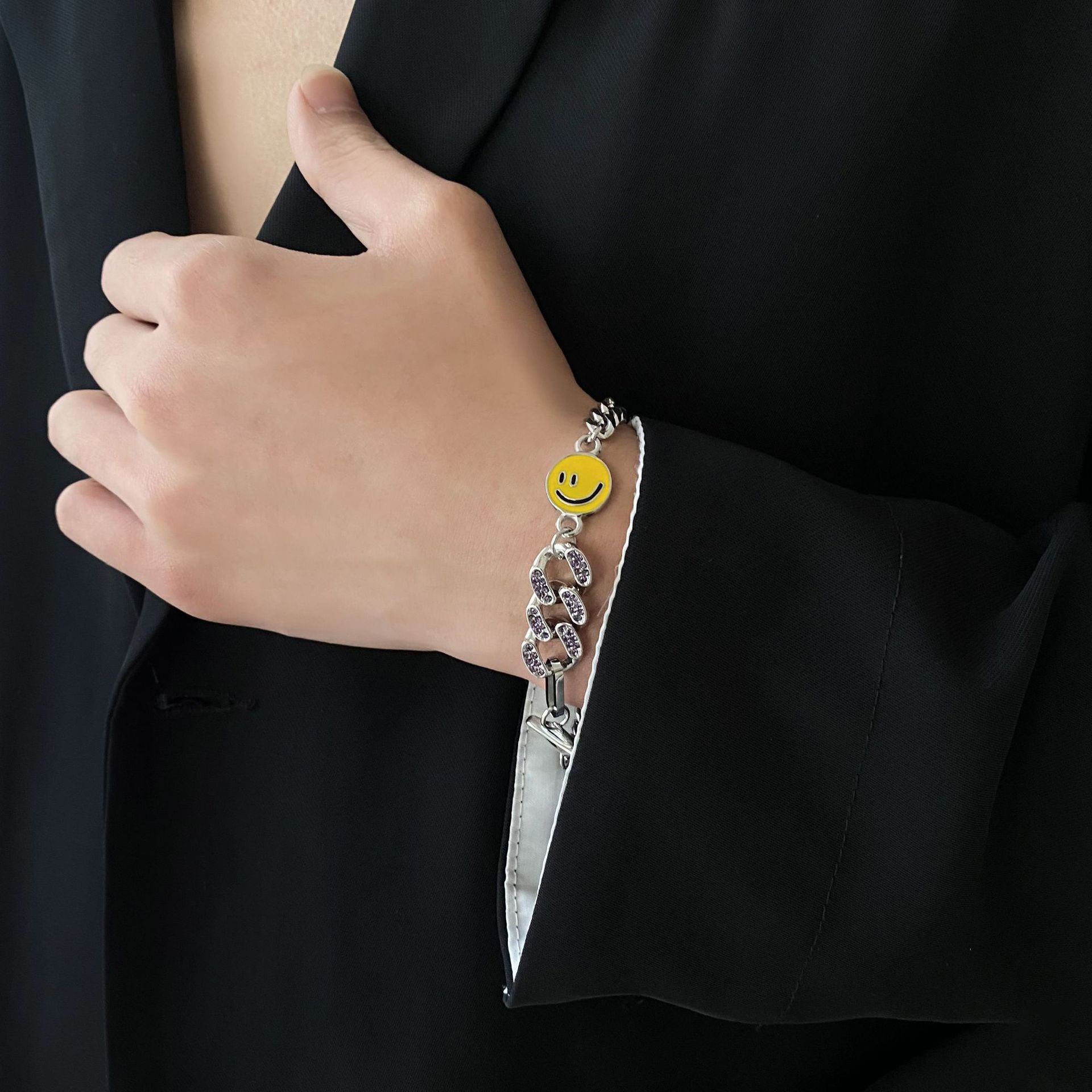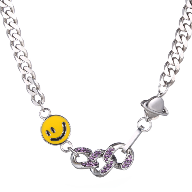 新款设计笑脸古巴镶钻星球嘻哈情侣手环钛钢男士百搭拼接手链