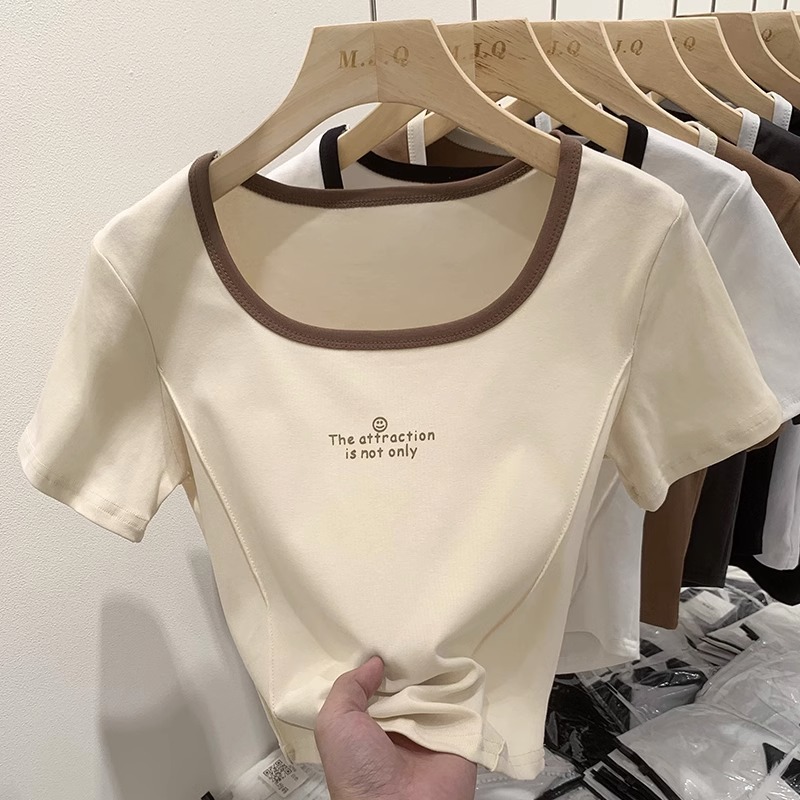 纯棉正肩方领露锁骨短袖t恤女新款夏修身显瘦短款不规则鱼骨体恤