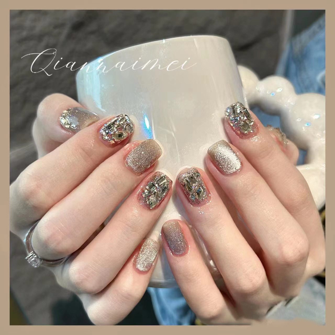 实拍穿戴甲纯手工美甲成品假指甲贴片高光灯泡猫眼爆闪香槟钻短甲