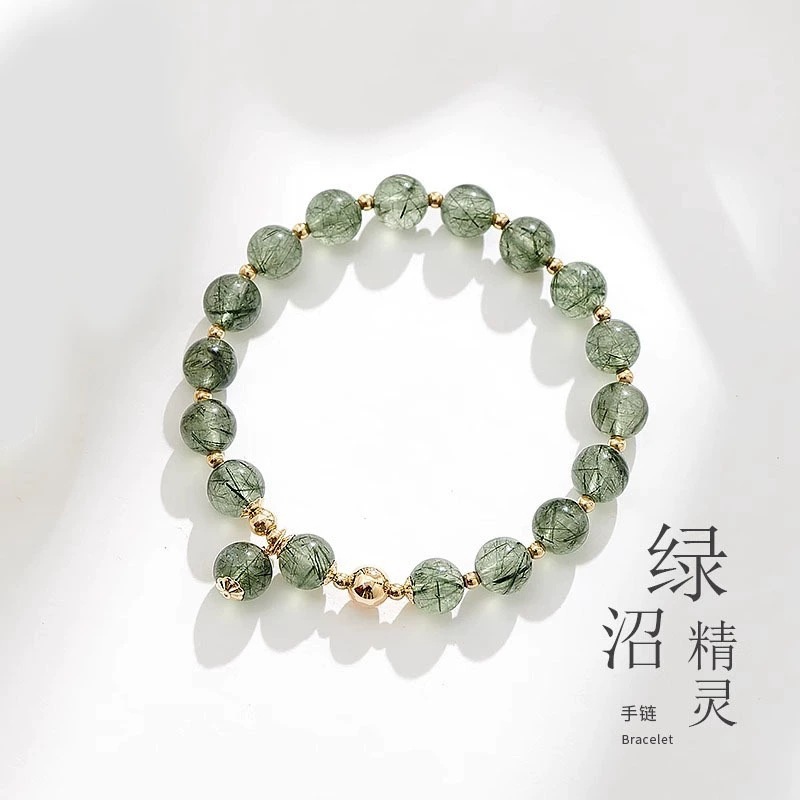 天然沼泽绿发晶手链转运珠水晶手串饰品ins潮送女友妈妈生日礼物