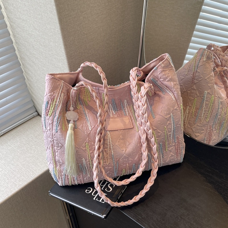 撞色织带帆布包刺绣单肩包女大容量学生手提托特包逛街