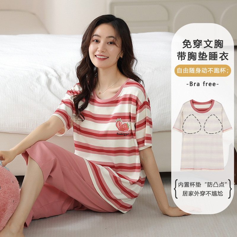 带胸垫睡衣女夏季纯棉薄款短袖七分裤休闲条纹外穿大码家居服套装