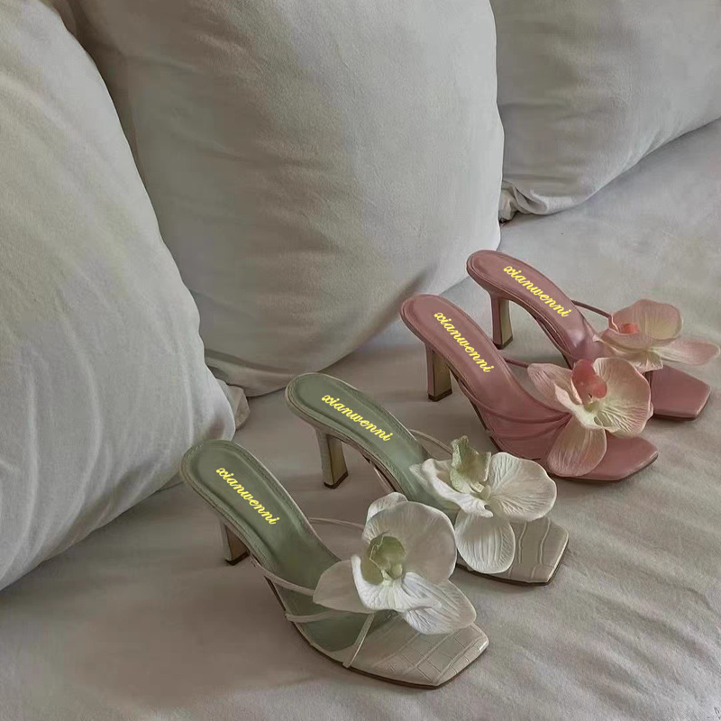 优雅风红色高跟鞋女新款花朵夹趾高跟拖鞋夏季配裙穿高跟凉鞋