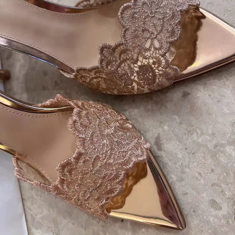 法式香槟色蕾丝高跟鞋新款尖头一字拖夏季名媛气质穿高跟凉鞋