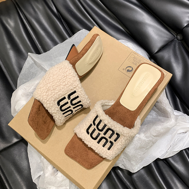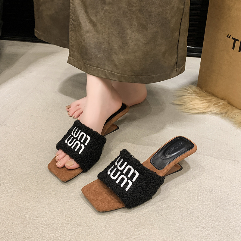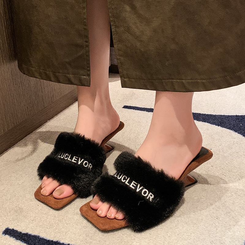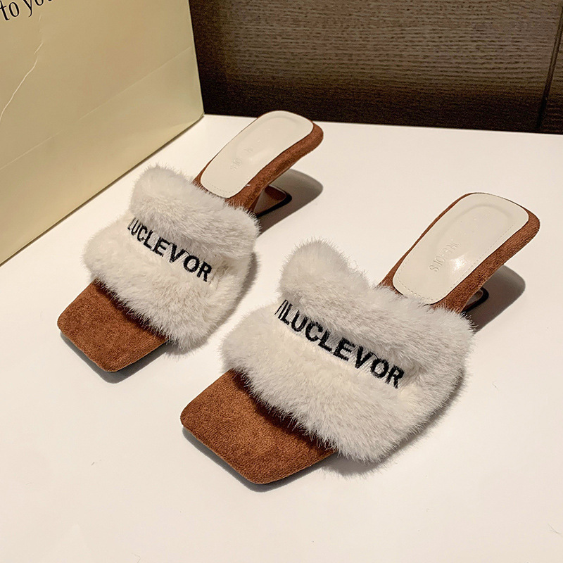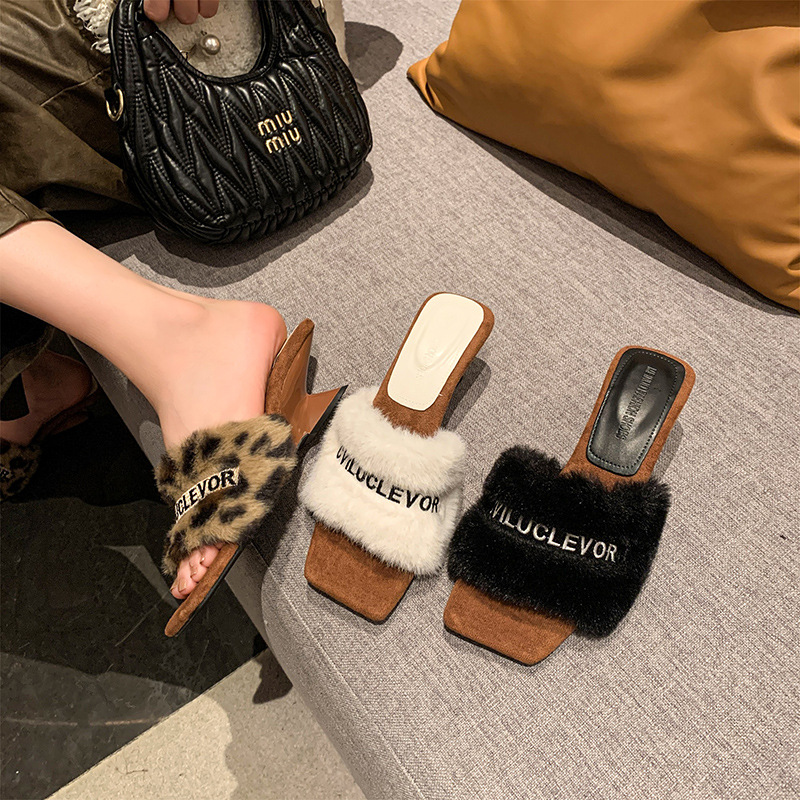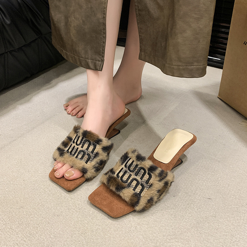 名媛风豹纹坡跟拖鞋女新款3厘米毛毛拖鞋~秋冬季保暖高跟拖鞋