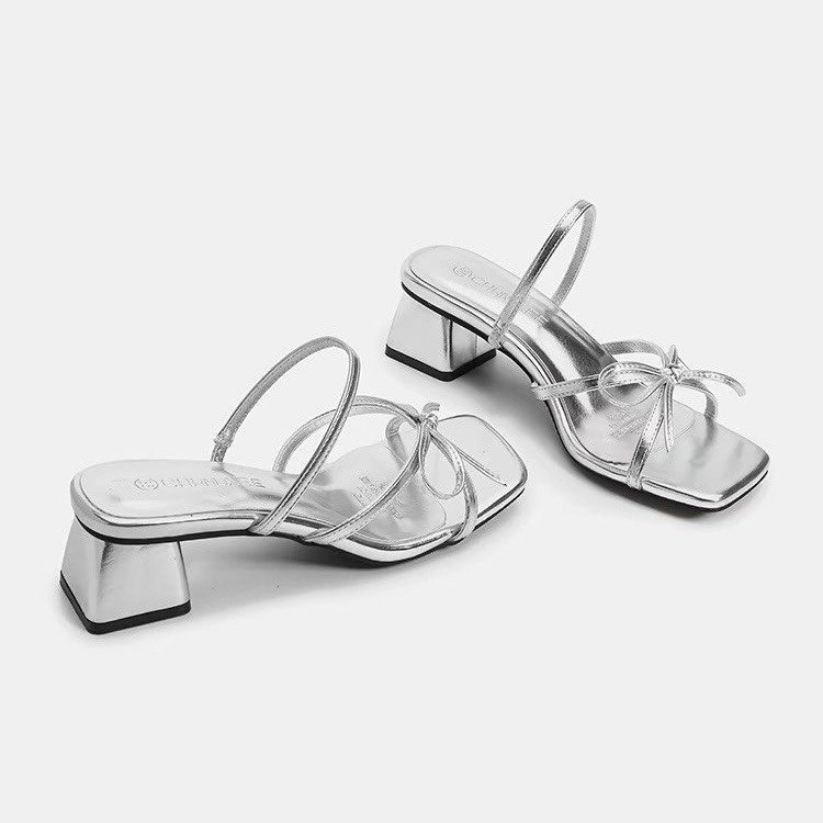 法式银色高跟鞋女两穿式凉鞋新款蝴蝶结凉拖夏季后绊带半拖鞋