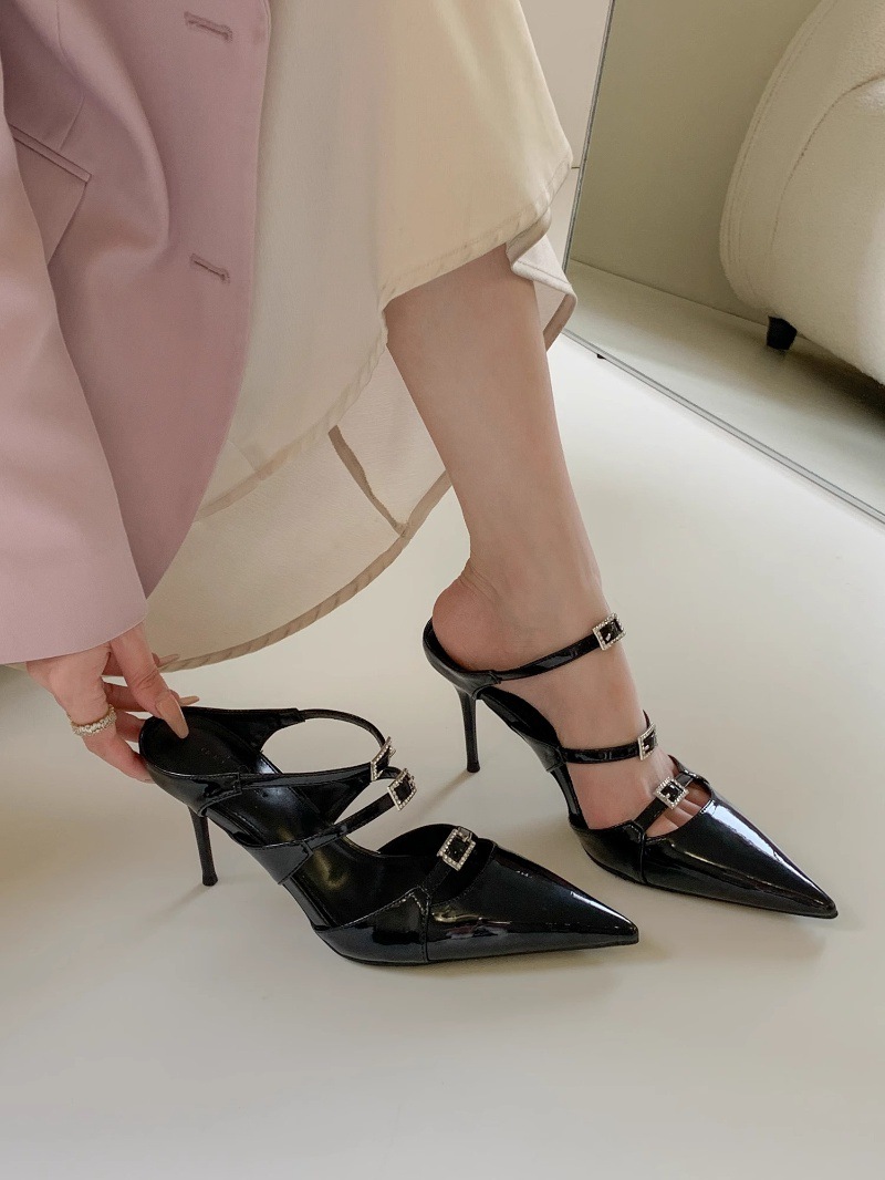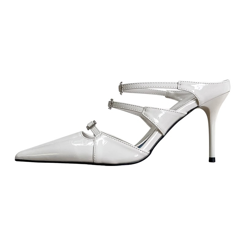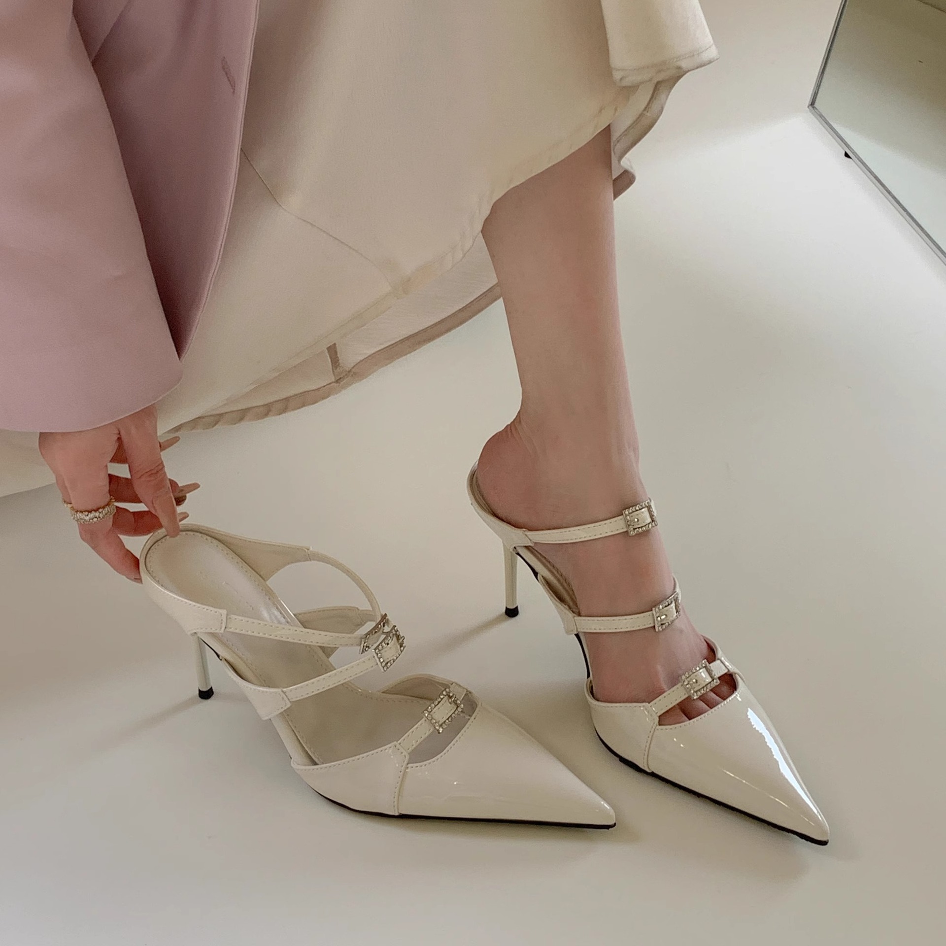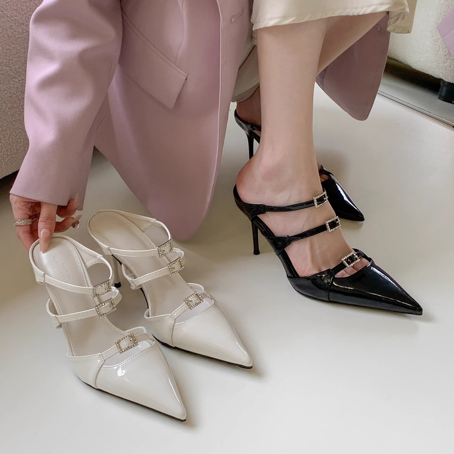 高跟鞋女包头年春夏新款名媛风白色尖头中跟水钻一字细跟凉拖