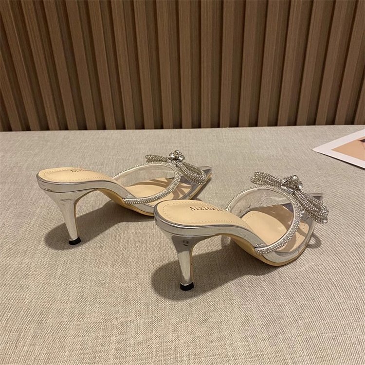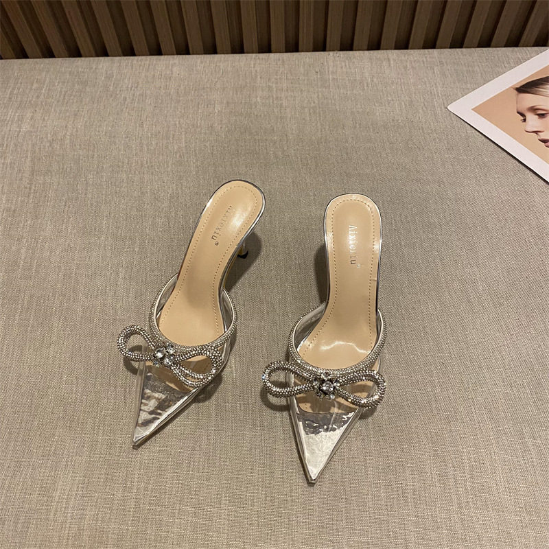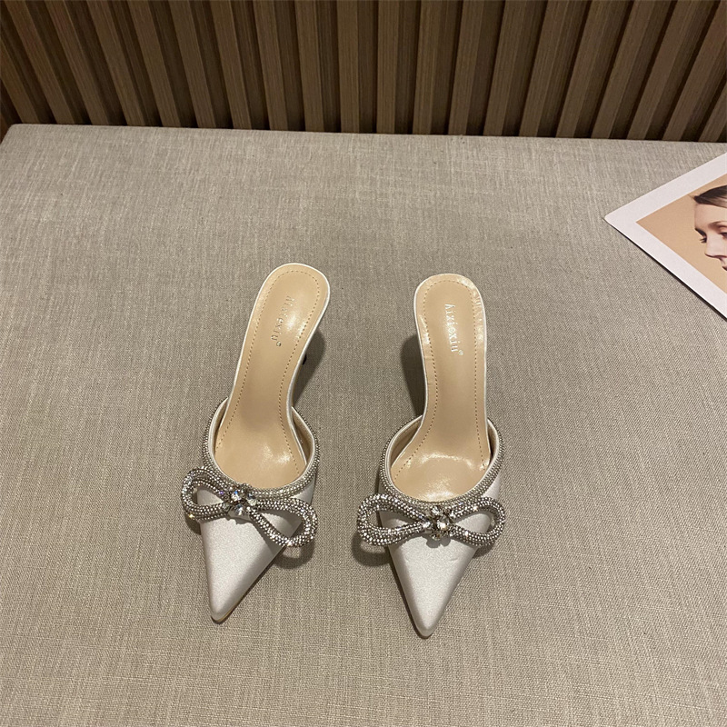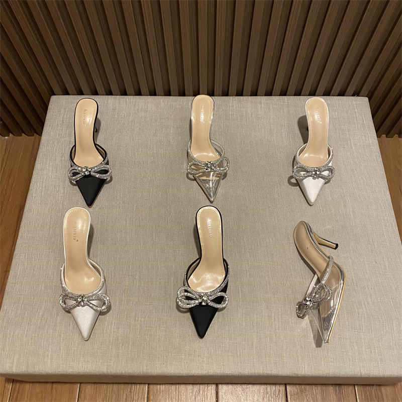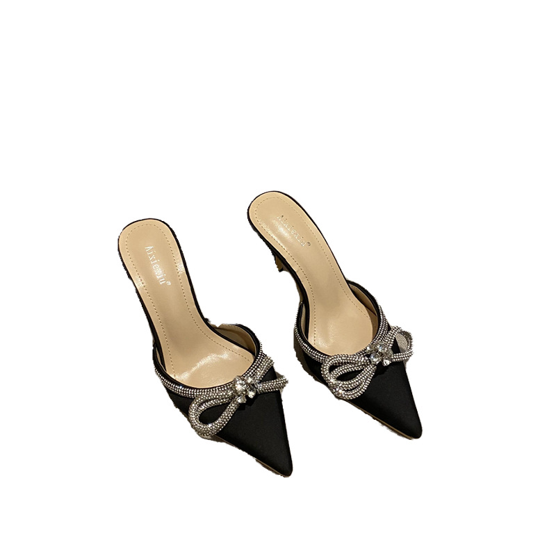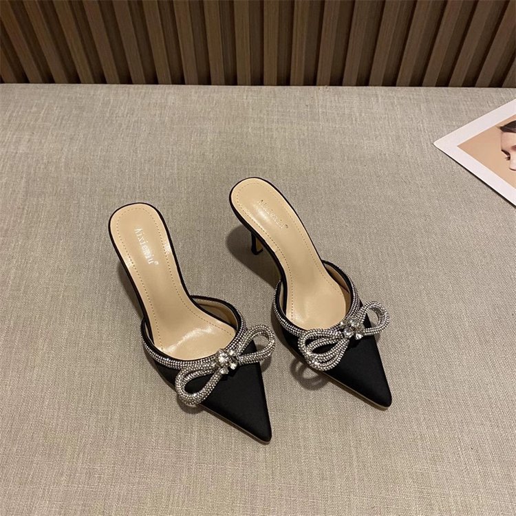 春夏新款尖头梅花水钻蝴蝶结高跟凉鞋女外穿细跟包头半拖鞋