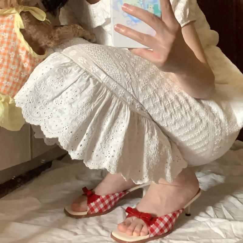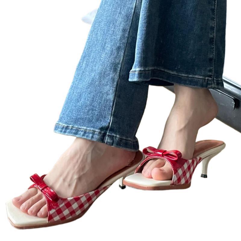 新款方头法式格子凉拖鞋女夏外穿绝美蝴蝶结露趾一字高跟凉鞋