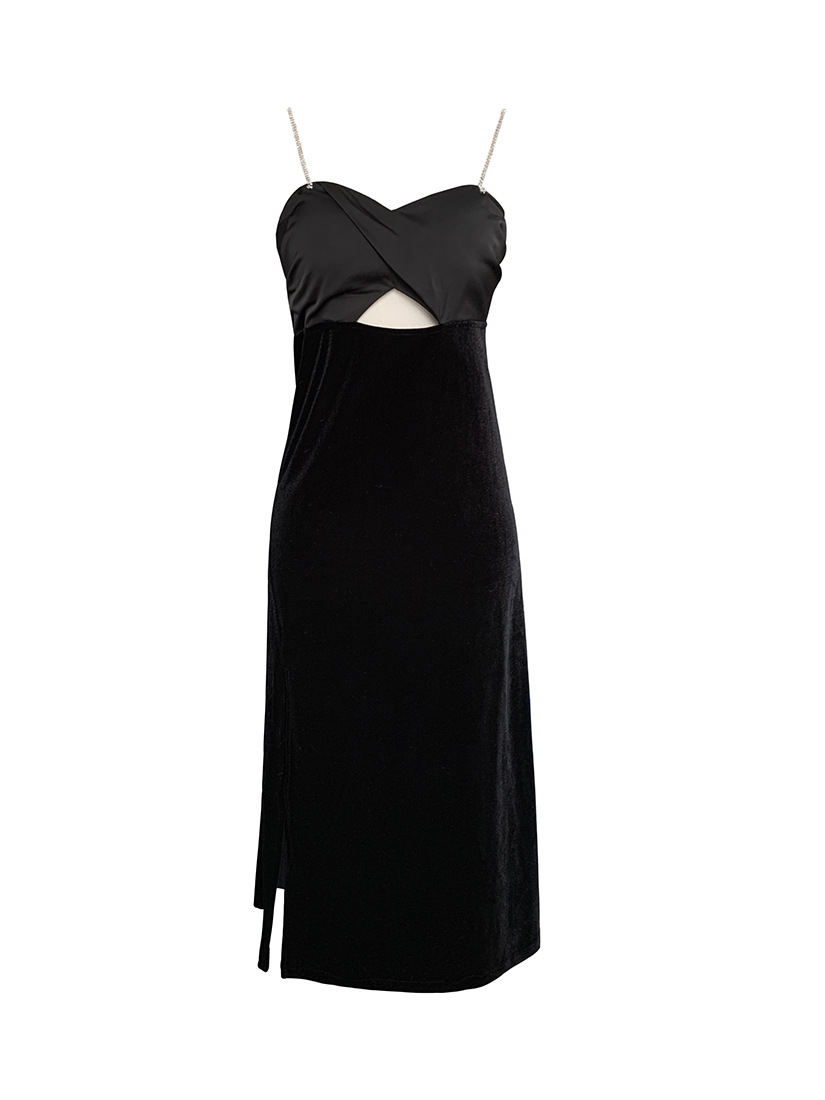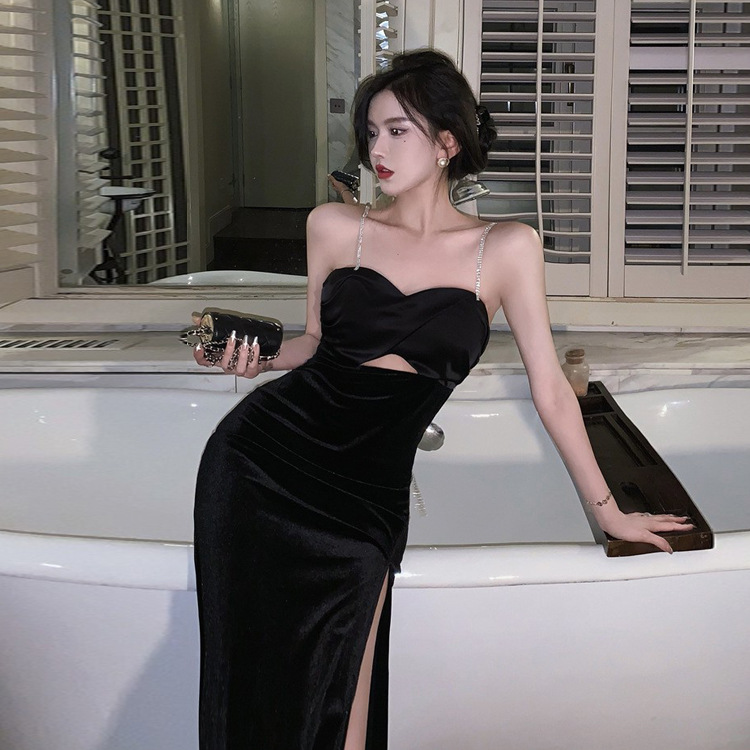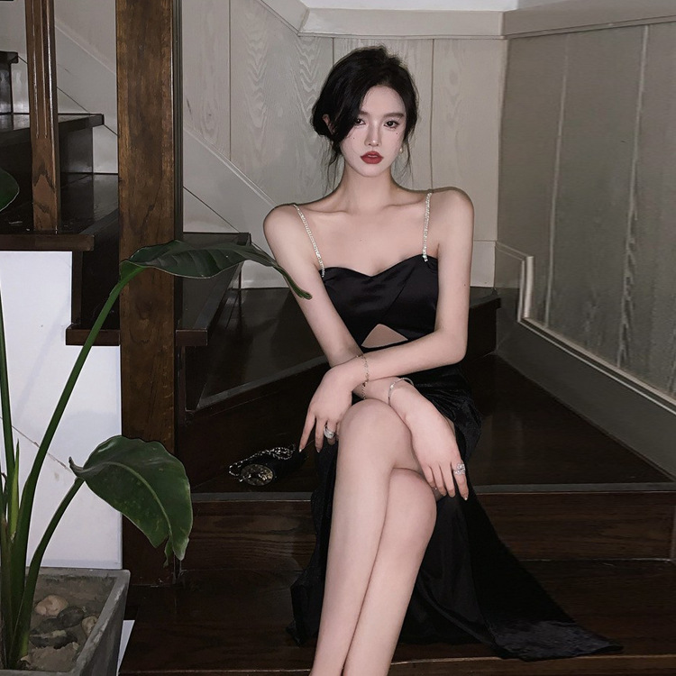 法式赫本高级感裙子性感小黑裙露背吊带party小礼服开叉连衣裙夏