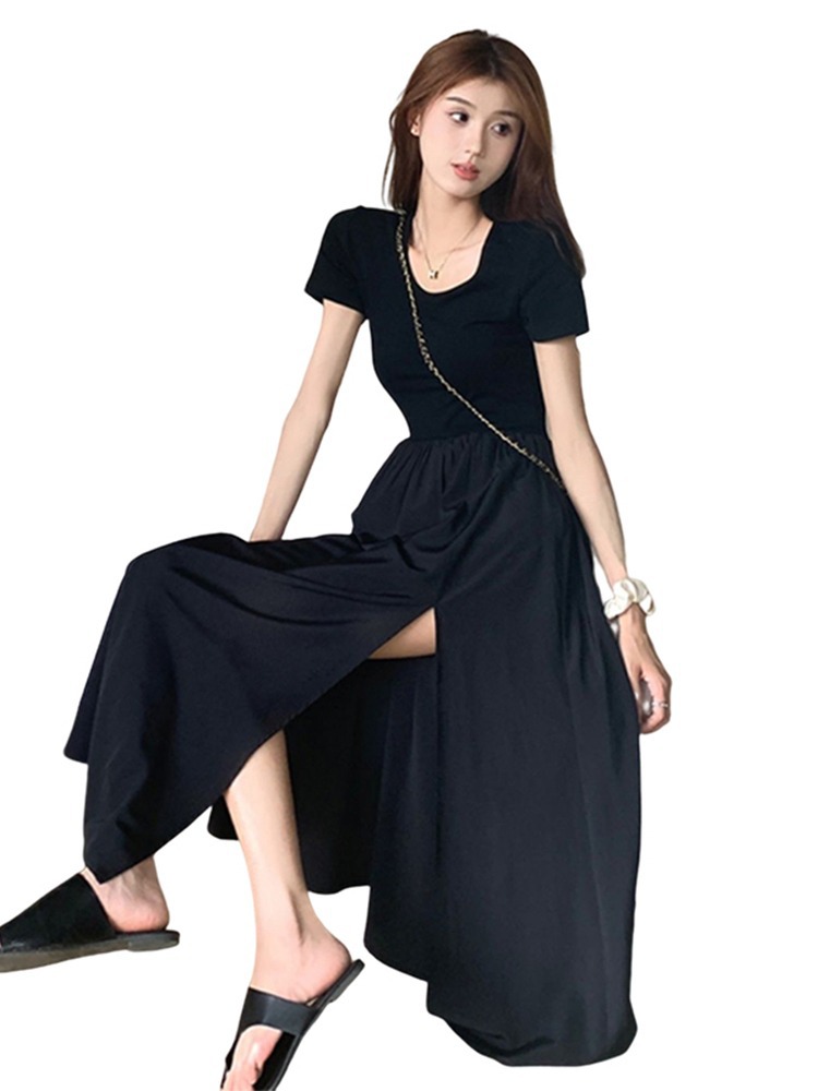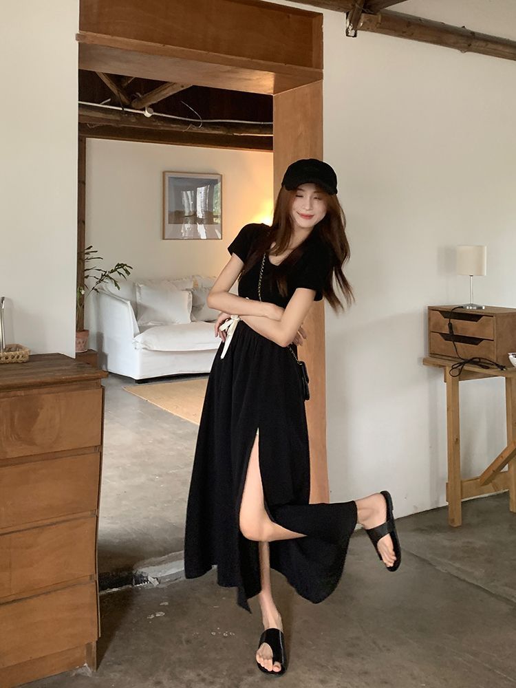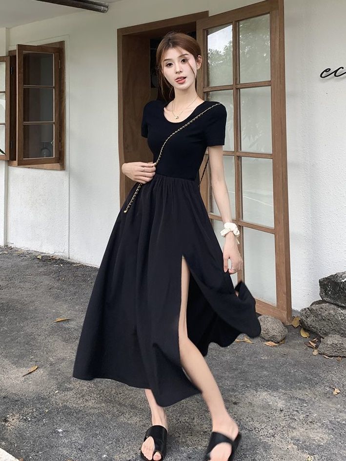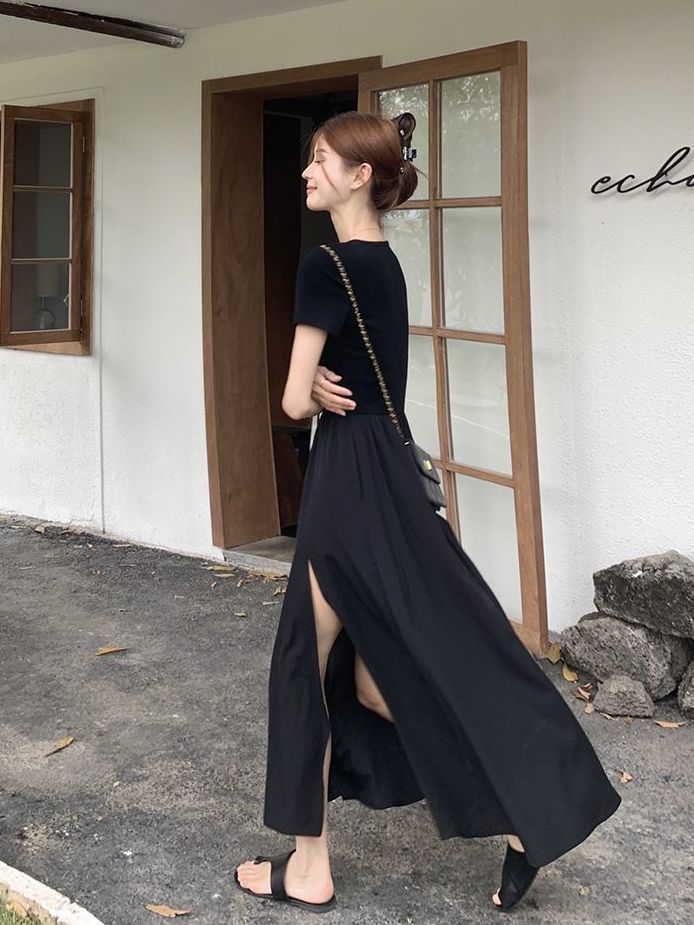 收腰连衣裙轻奢法式赫本风不规则开叉黑色连衣裙女夏
