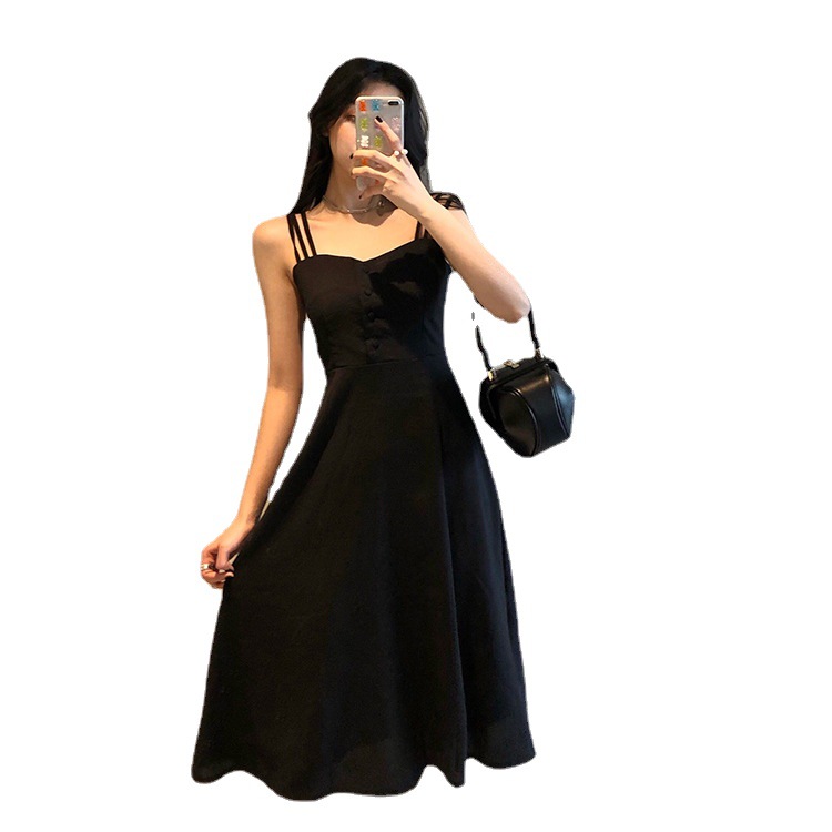 春夏新款女装小黑裙法式赫本风吊带连衣裙子小个子打底长裙子