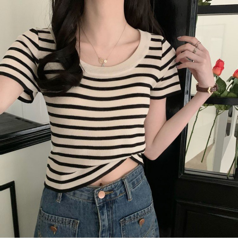 日系休闲短袖正肩修身条纹T恤女夏季新款撞色港味短款套头上衣潮